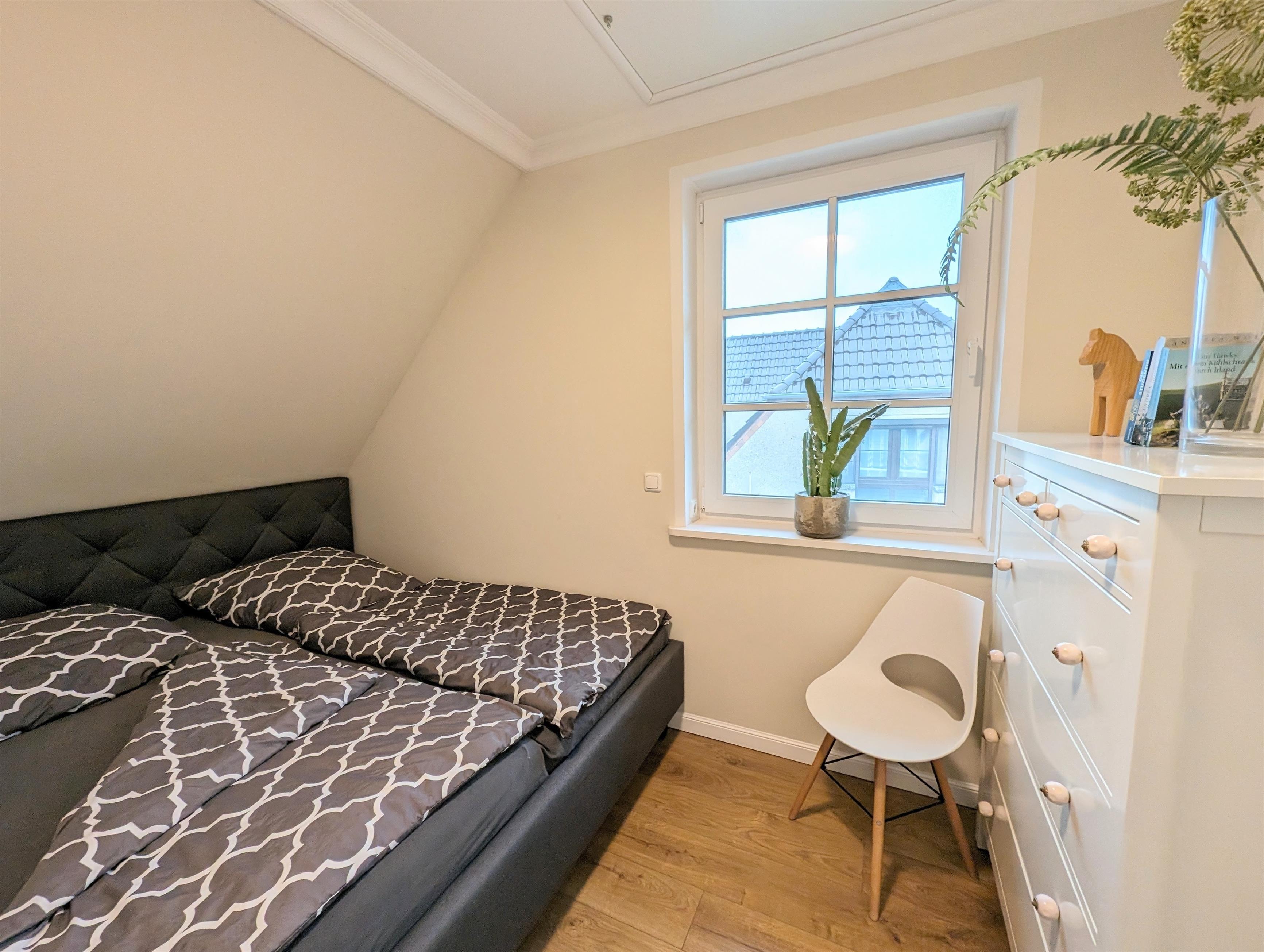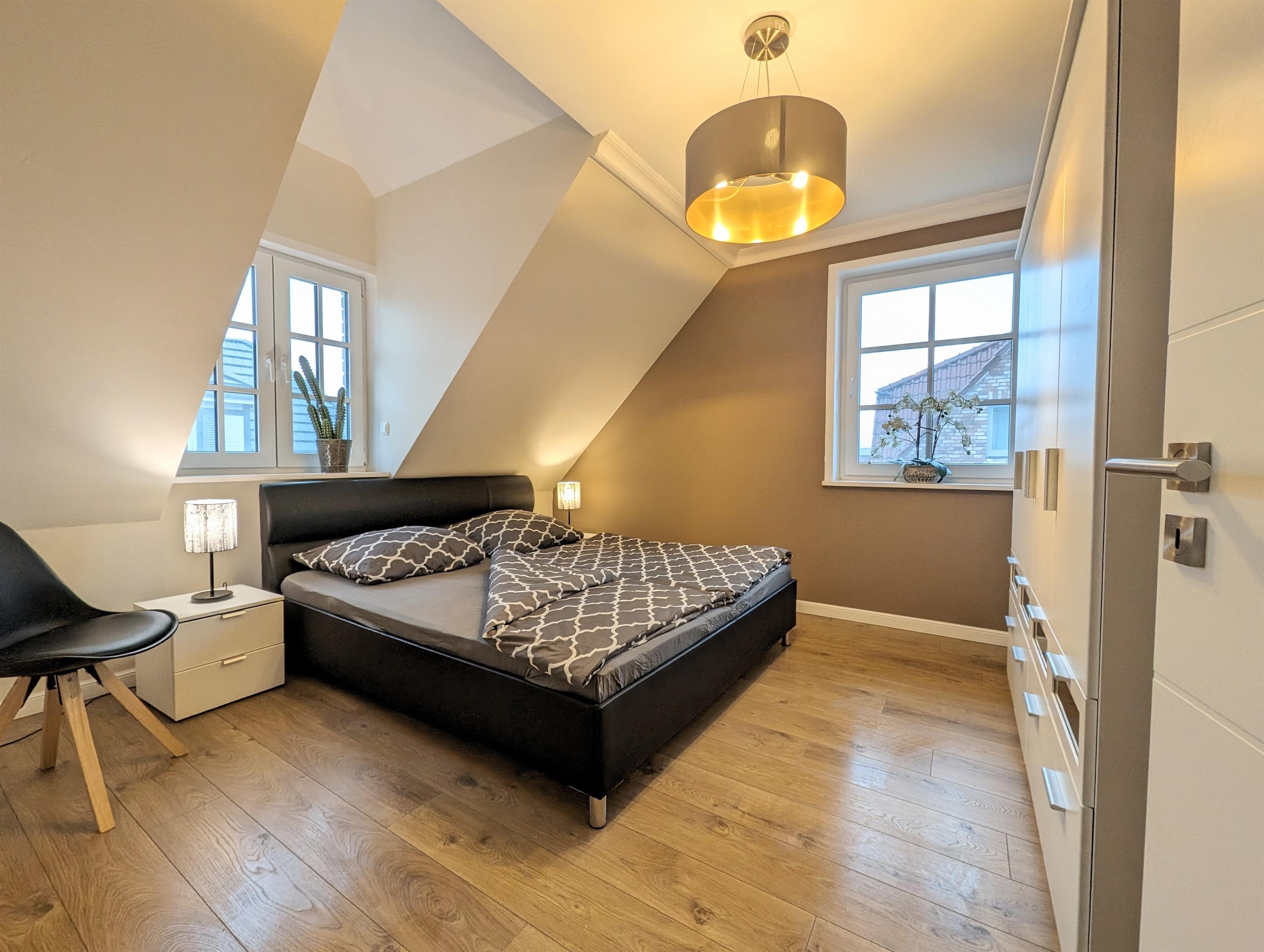 In dieser Wohnung finden Sie eine stilvolle Ausstattung und hohen Wohnkomfort. Auf 120 m² bietet die Wohnung bis zu 6 Personen ausreichend Raum für einen erholsamen Urlaub. Der große Wohnbereich, mit Sofalandschaft, voll ausgestatteter Küchenzeile und Essbereich, lädt zum Verweilen mit der Familie oder Freunden ein. Insgesamt verfügt die Wohnung über drei Schlafzimmer mir je einem Doppelbett. Im großzügigen und modernen Badezimmer finden Sie eine Badewanne, eine separate Dusche, einen Waschbereich und eine Waschmaschine. Im Erdgeschoss befindet sich zudem ein Gäste WC zur Mitnutzung. Beheizt wird die gesamte Wohnung über eine Fußbodenheizung. An allen Fenstern befinden sich elektrische Rolläden. WLAN ist im gesamten Haus kostenlos vorhanden. Die Wohnung liegt in der 1. Etage. Im Erdgeschoss befindet sich nur eine Garage.
