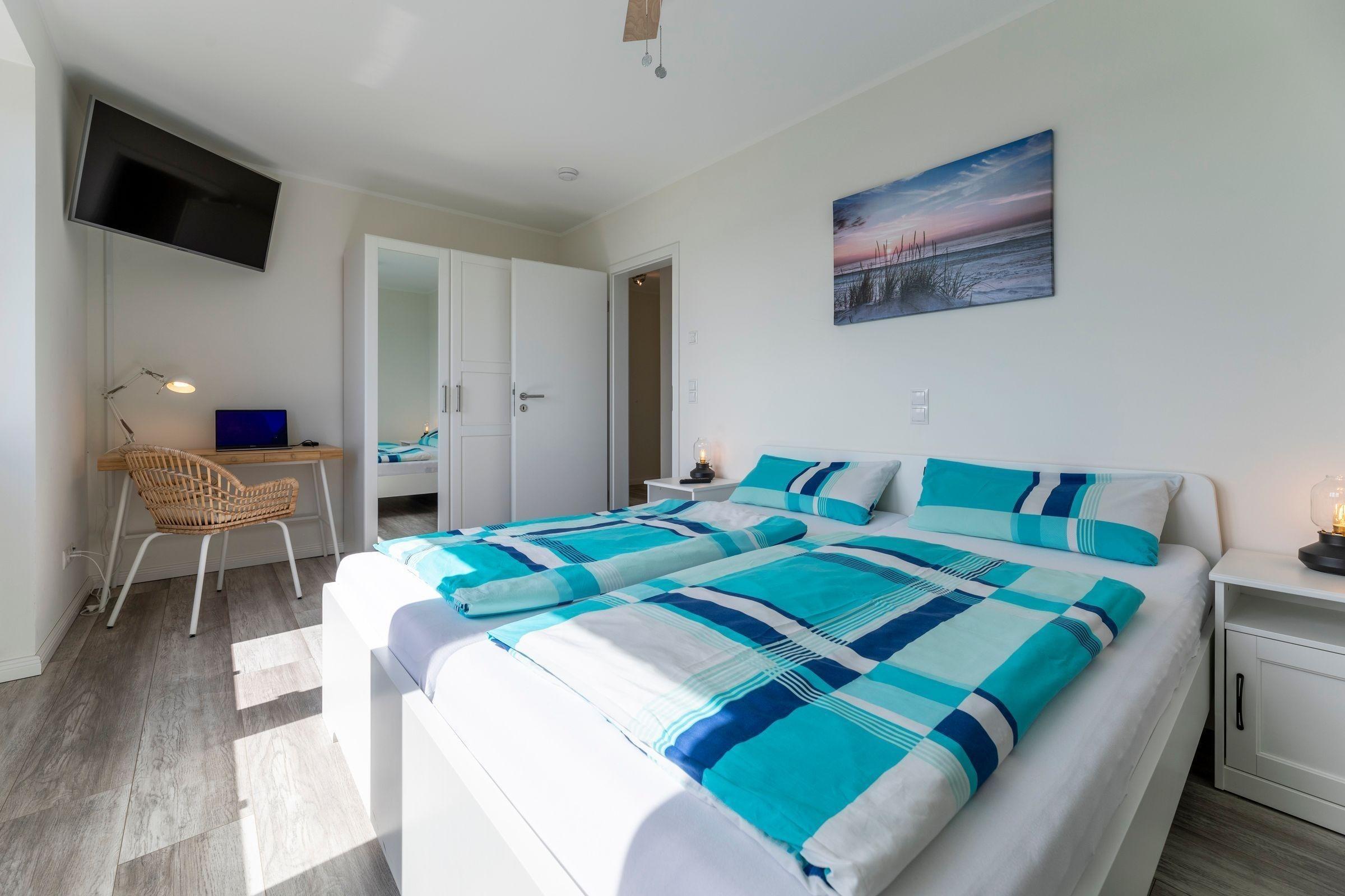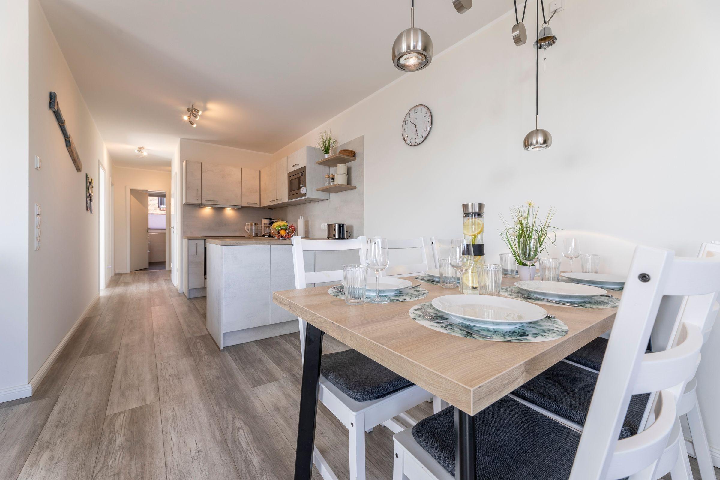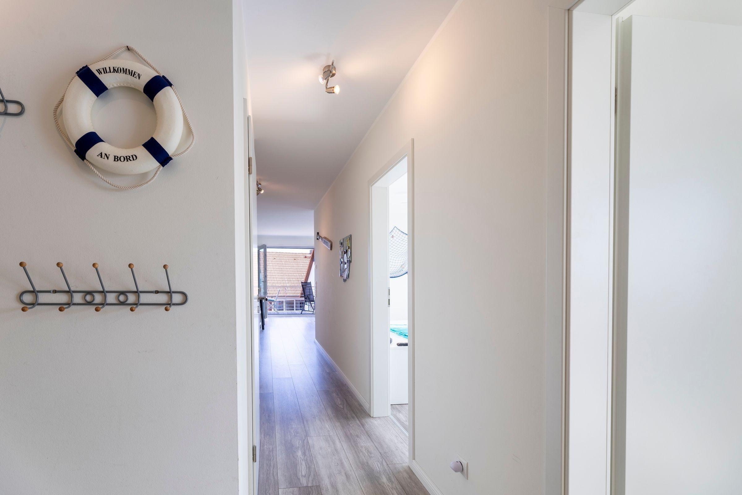Die moderne Ferienwohnung „Emmas Kajüte“ bietet auf 73 qm Platz für 4 bis 6 Personen. Im ersten Obergeschoss gelegen, sind die lichtdurchfluteten Schlafzimmer mit Doppelbetten und ausreichend Stauraum ausgestattet, während das großzügige Wohnzimmer direkten Zugang zu einem möblierten Balkon hat. Eine offene, voll ausgestattete Küche mit Geschirrspüler, Induktionsherd, Mikrowelle, Kaffeemaschine und Kühlschrank sorgt für kulinarischen Komfort. Das Vollbad bietet moderne Annehmlichkeiten wie Dusche und WC. Der Hauswirtschaftsraum verfügt über eine Waschmaschine zur alleinigen Nutzung. WLAN ist kostenlos verfügbar. Diese Ferienwohnung befindet sich in einer Anlage, die einen Fahrstuhl sowie Fahrradabstellplätze im Nebenhaus bietet. Ein Stellplatz für 1 PKW ist ebenfalls vorhanden.