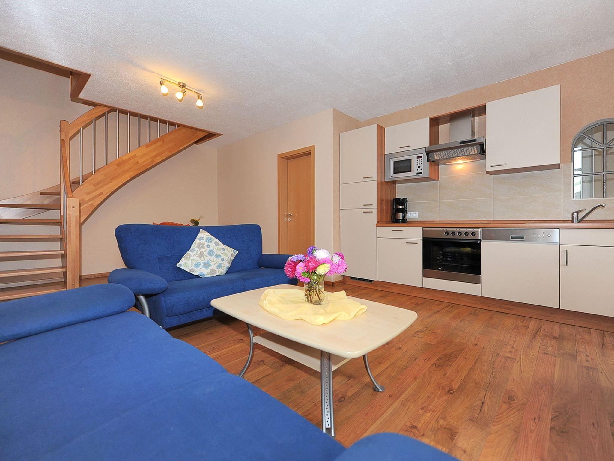 Größe ca. 70 Quadratmeter, Wohnraum mit integrierter Küche, Schlafzimmer, zweites separates, Schlafzimmer/Kinderzimmer, Badezimmer mit Dusche, Waschtisch und WC, Erdgeschoss, Obergeschoss