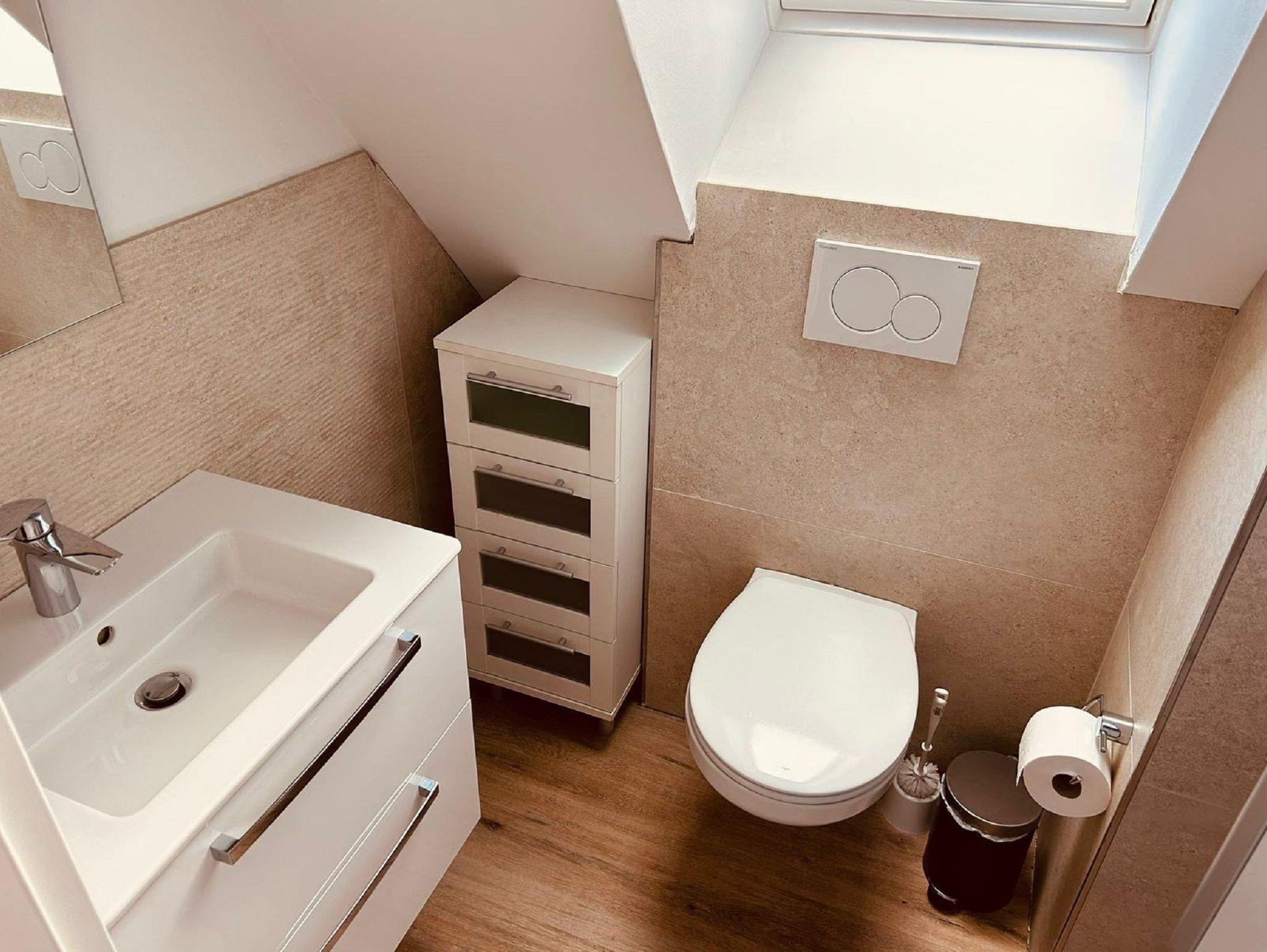 Das moderne Badezimmer verfügt über eine bodentiefe Dusche, ein WC und eine Waschmaschine + Trockner. Es gibt ein zusätzliches Gäste WC. Die Ferienwohnung erreichen Sie über einen separaten Eingang unseres Hotels.