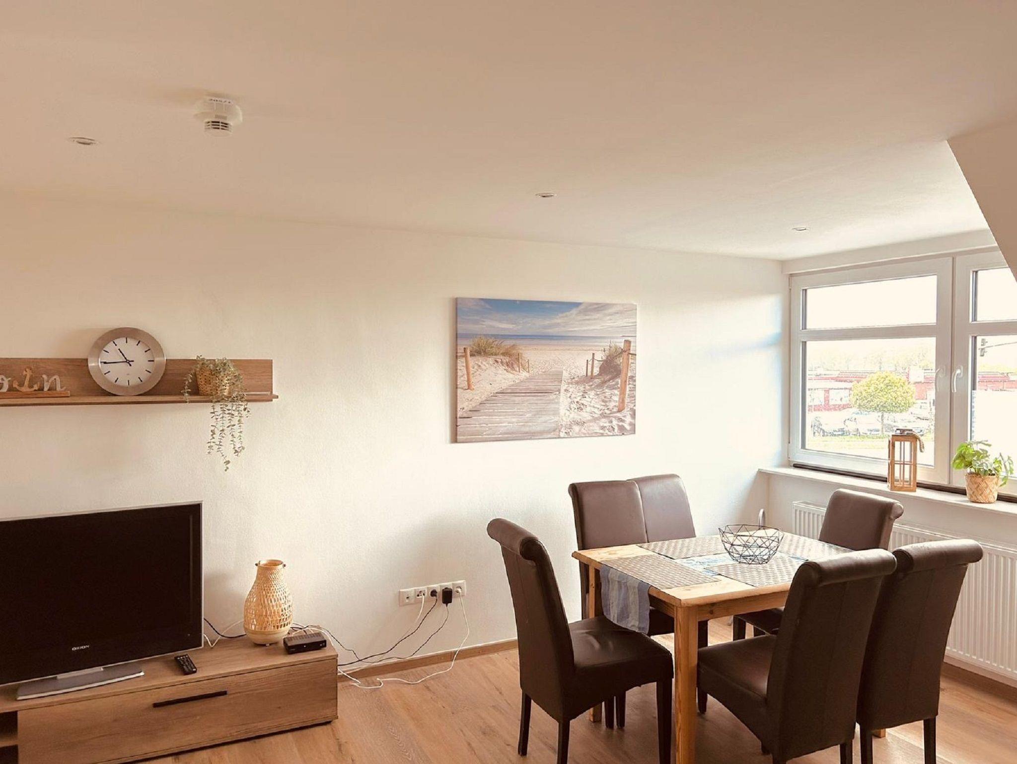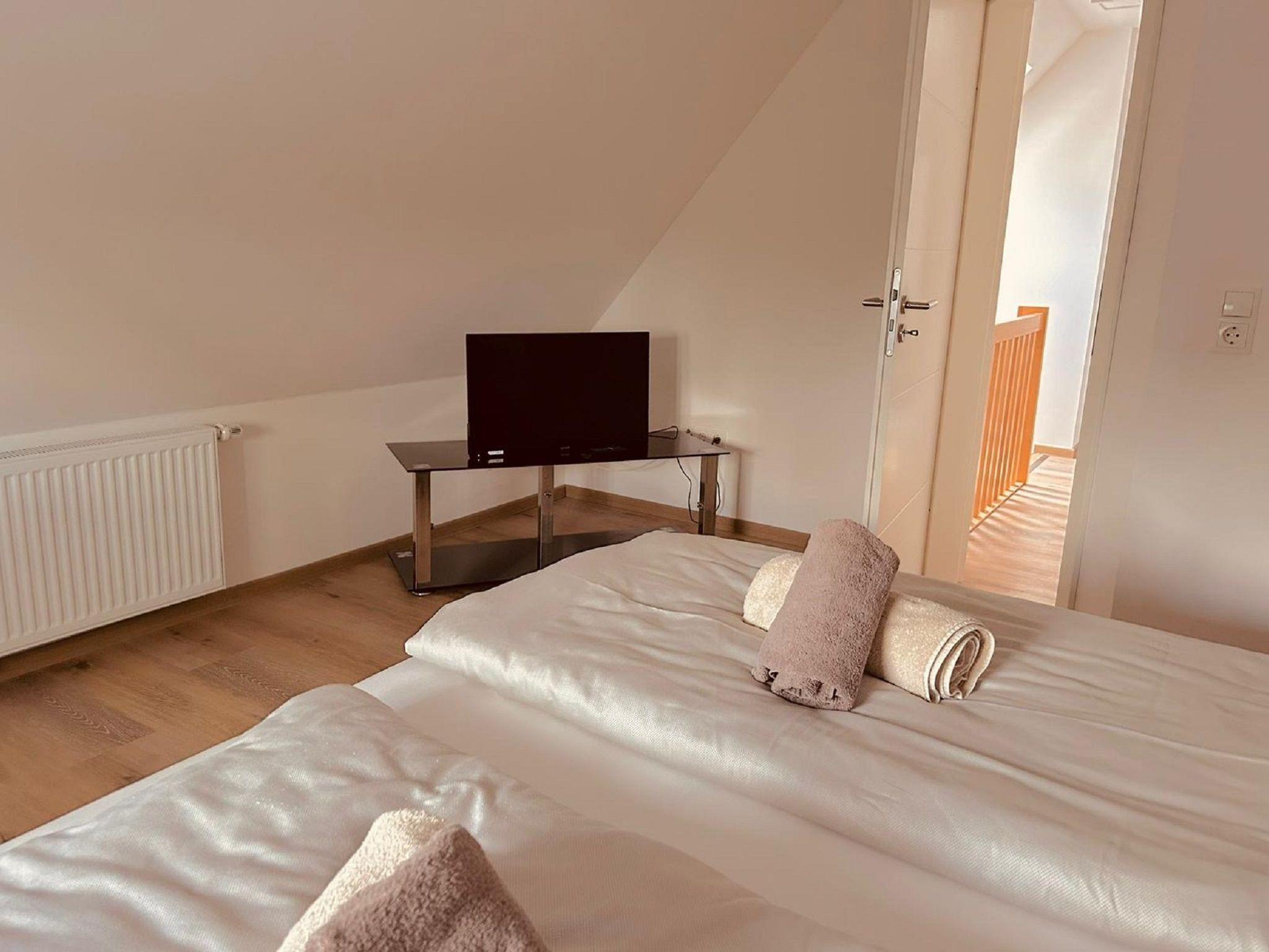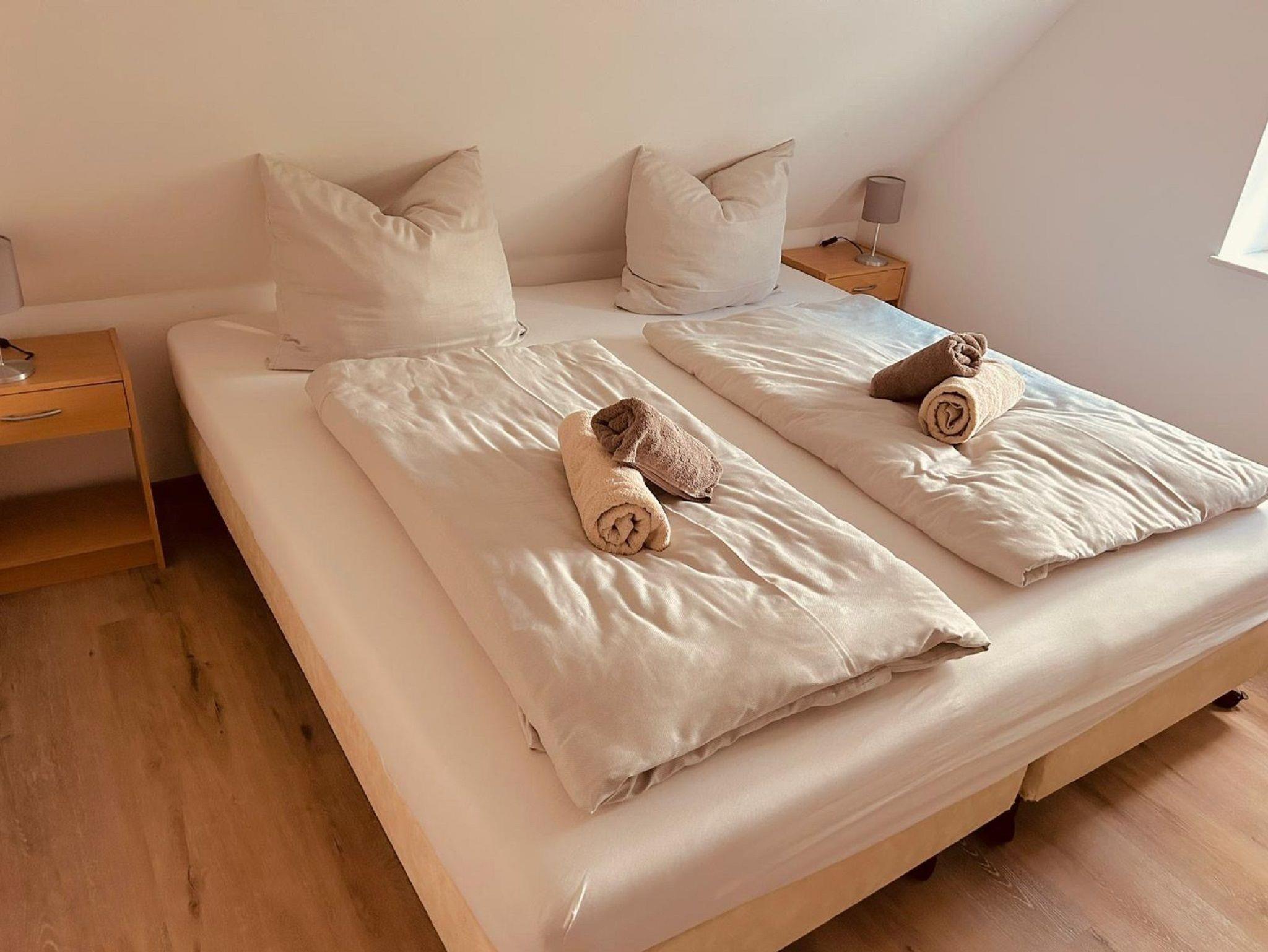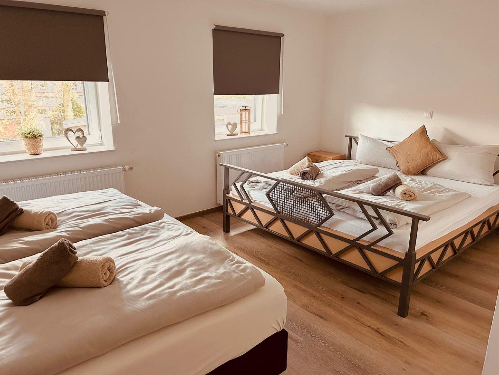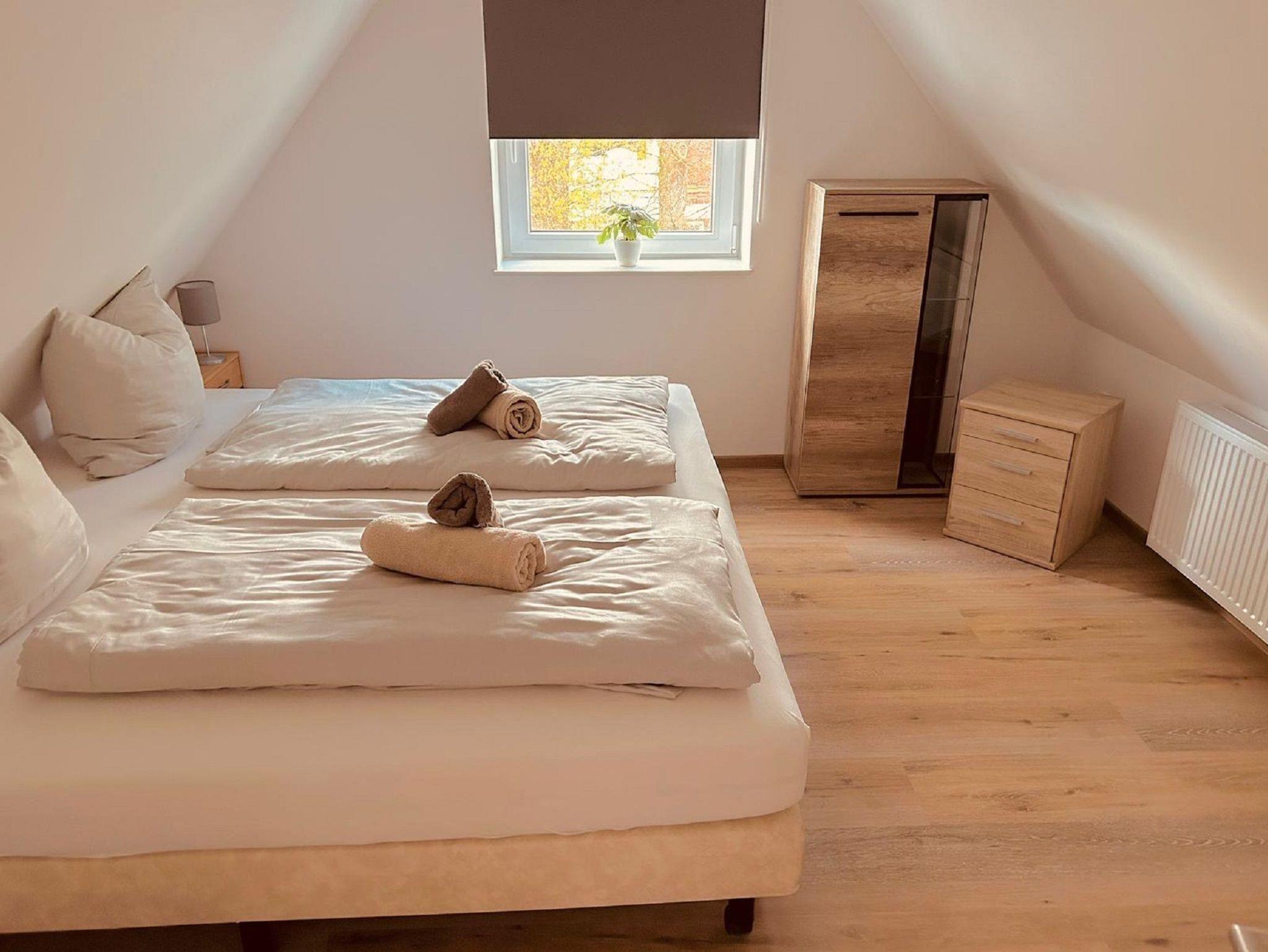 Im Wohn- und Essbereich finden sie eine offene Küche mit Essbereich und einer gemütlichen L-Couch mit TV-Ecke. Vom Wohnbereich gelangen Sie auf die große Dachterrasse. Die Schlafräume unterteilen sich je in ein Schlafzimmer mit großem Doppelbett (180x200cm) sowie einem zusätzlichem französischen Bett ( 140x200cm), ein weiterer Schlafraum verfügt über 2 Einzelbetten (je 90x200cm) und der dritte Schlafraum verfügt über ein Doppelbett in (180x200cm). In jedem Schlafraum finden Sie ein TV-Gerät. Die Schlafräume sind über 2 Etagen über eine Treppe innerhalb der Ferienwohnung erreichbar.