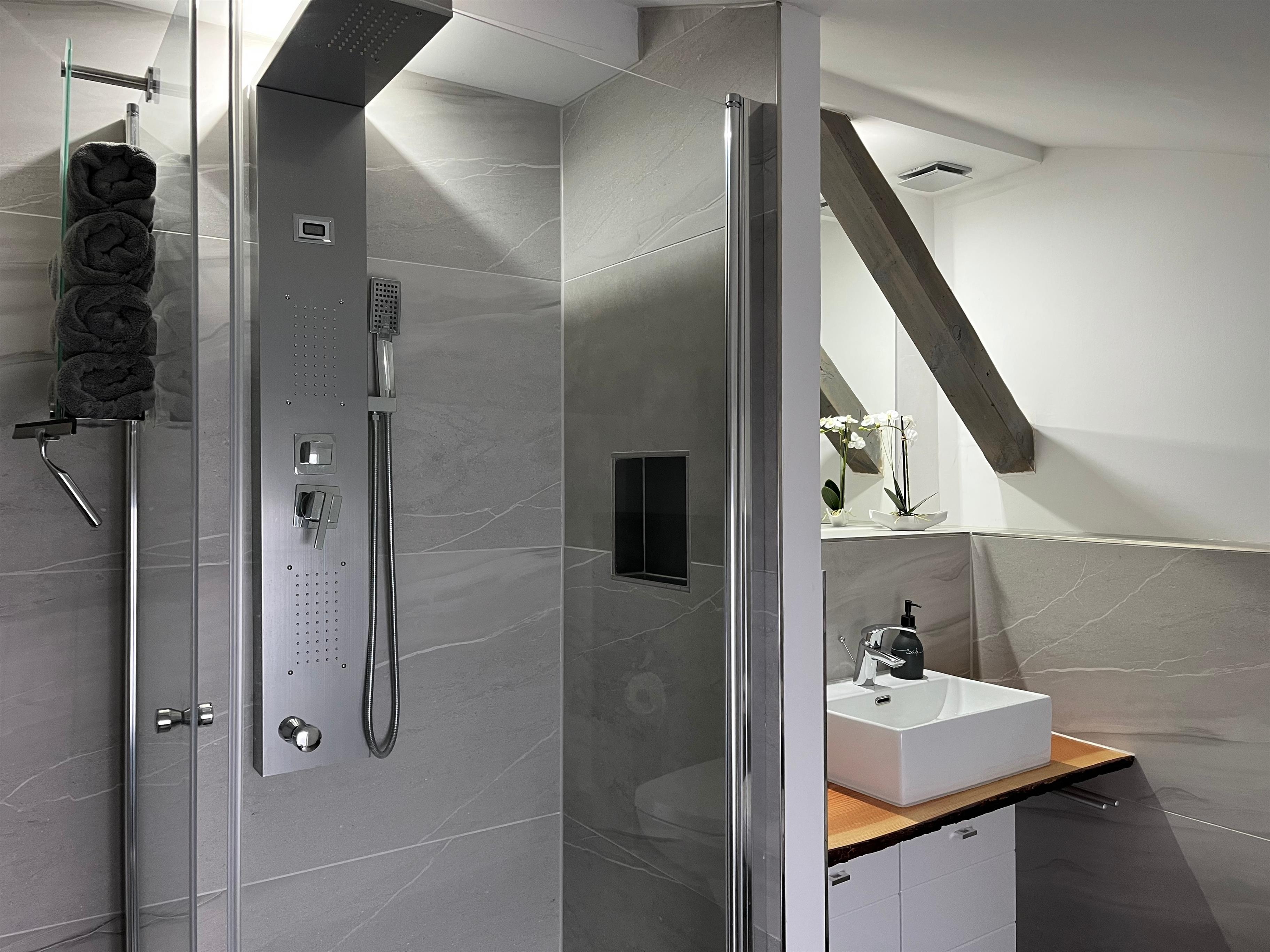 Das Tageslichtbad mit Dusche ist mit Waschmaschine und Fußbodenheizung ausgestattet. Bettwäsche und Handtücher sind inclusive.In der gesamten Unterkunft gibt es freies WLAN und einen Smart TV mit Satellitenanschluss.