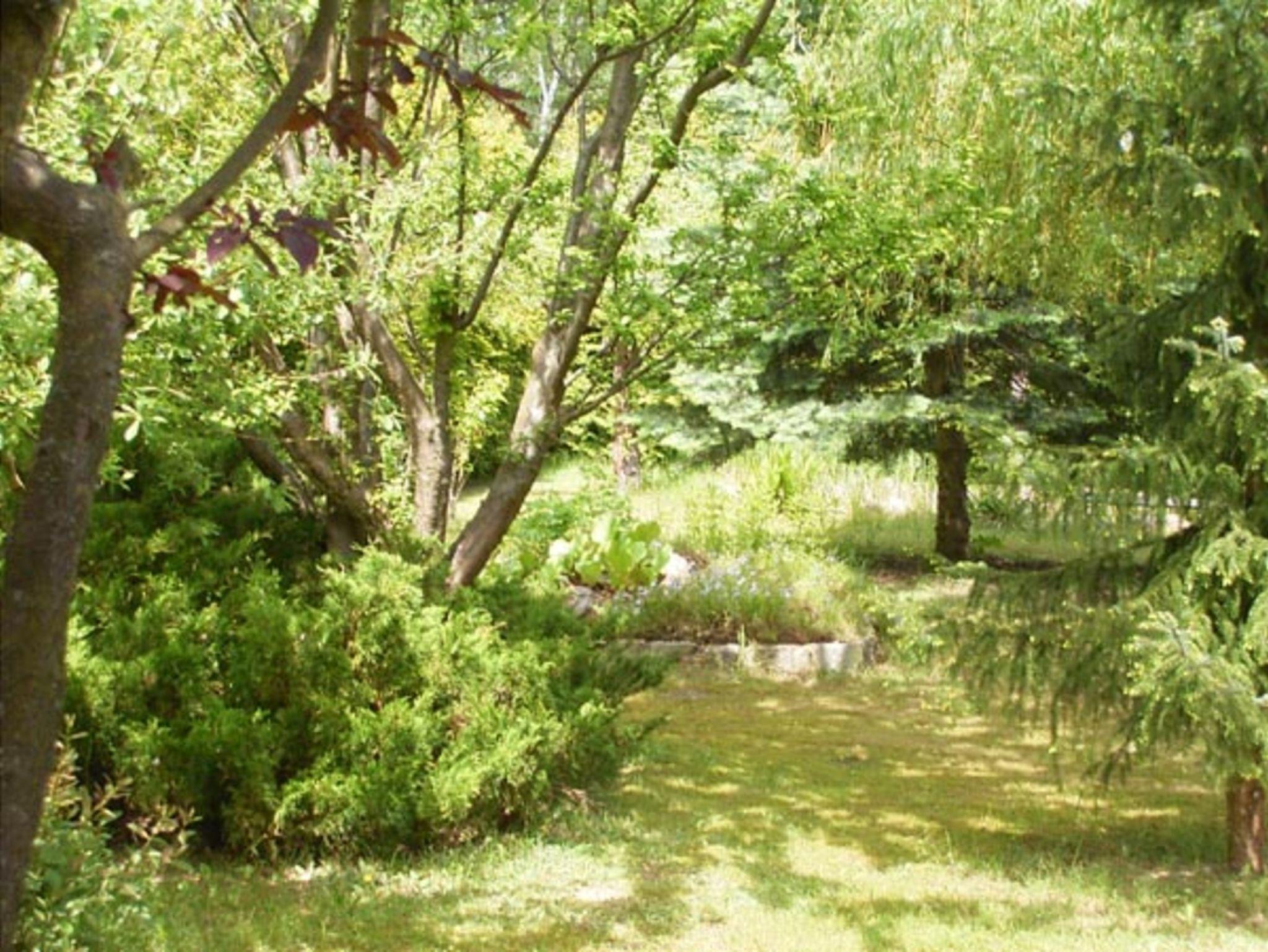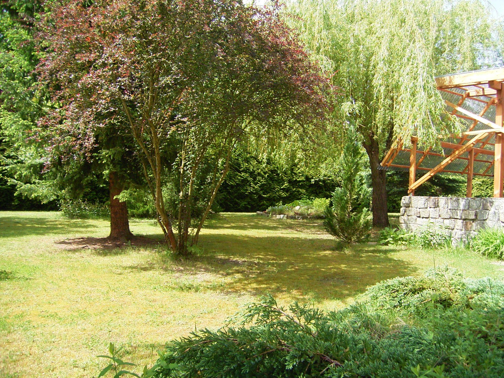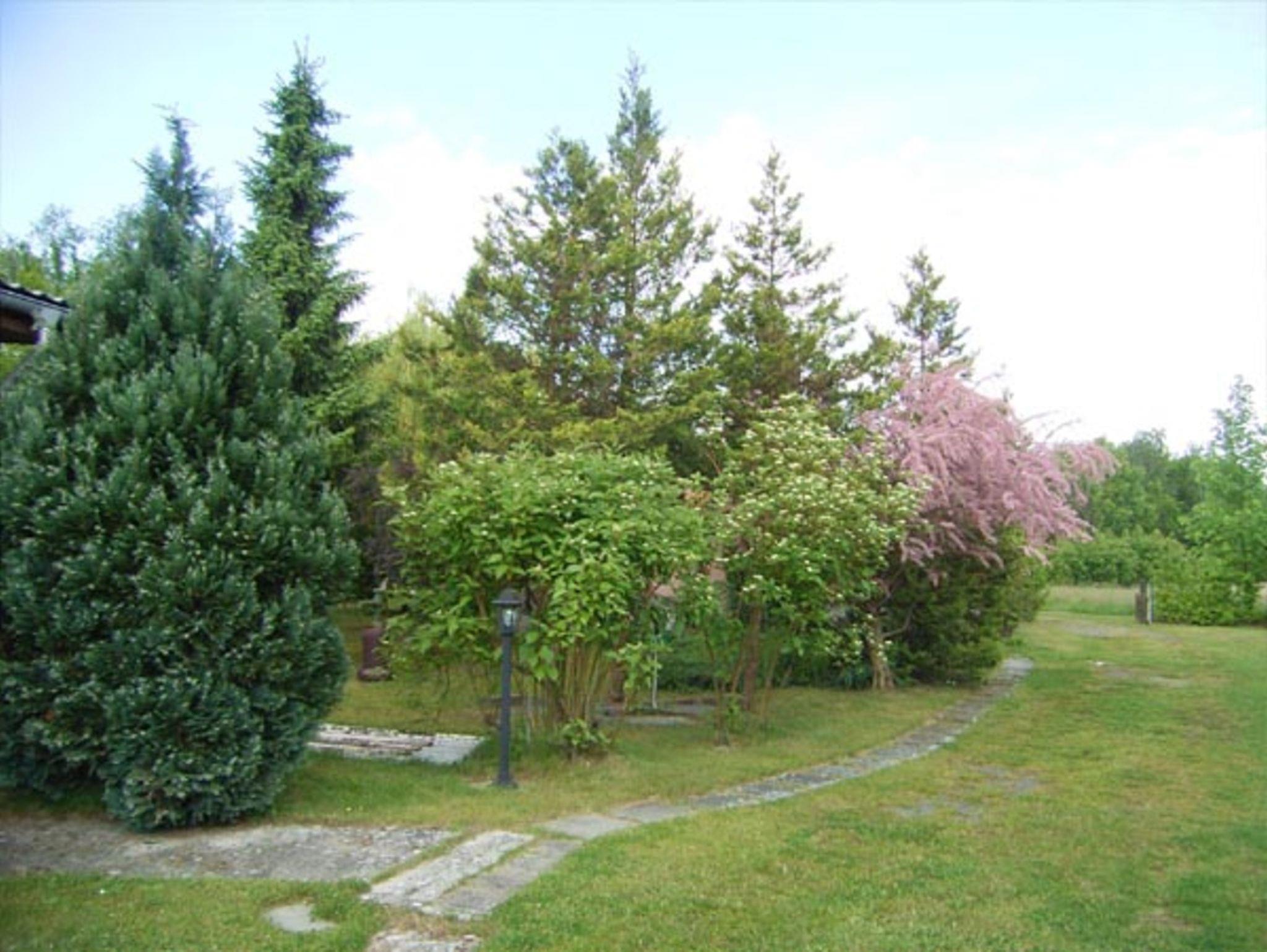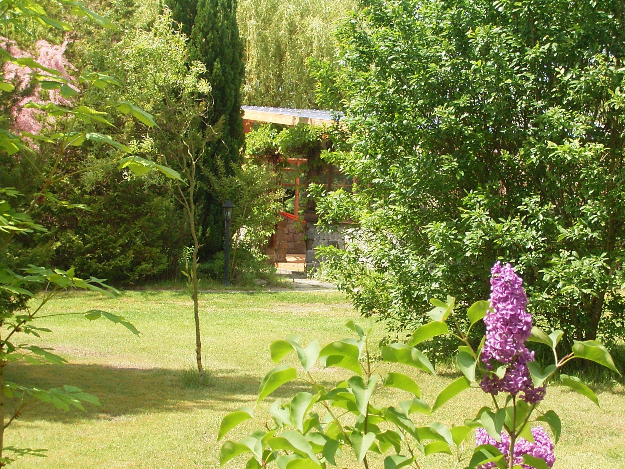In der Nähe eines Bahnübergangs idyllisch am Waldrand gelegener, modern eingerichteter Bungalow, in großer gepflegter Gartenanlage (5000 m²), durch Hecken und Gebüsch vom Haupthaus abgegrenzt, in dem der Eigentümer wohnt.