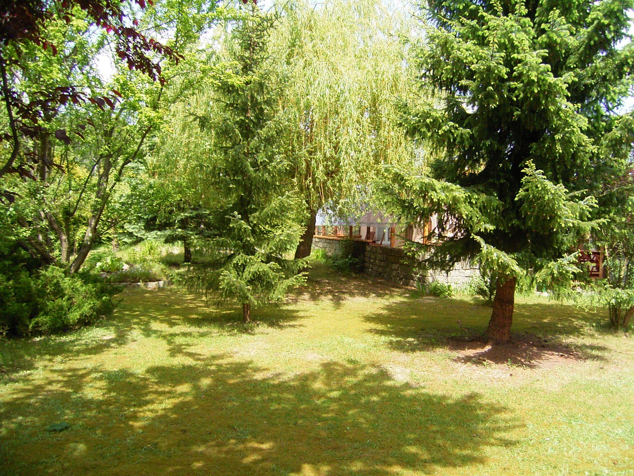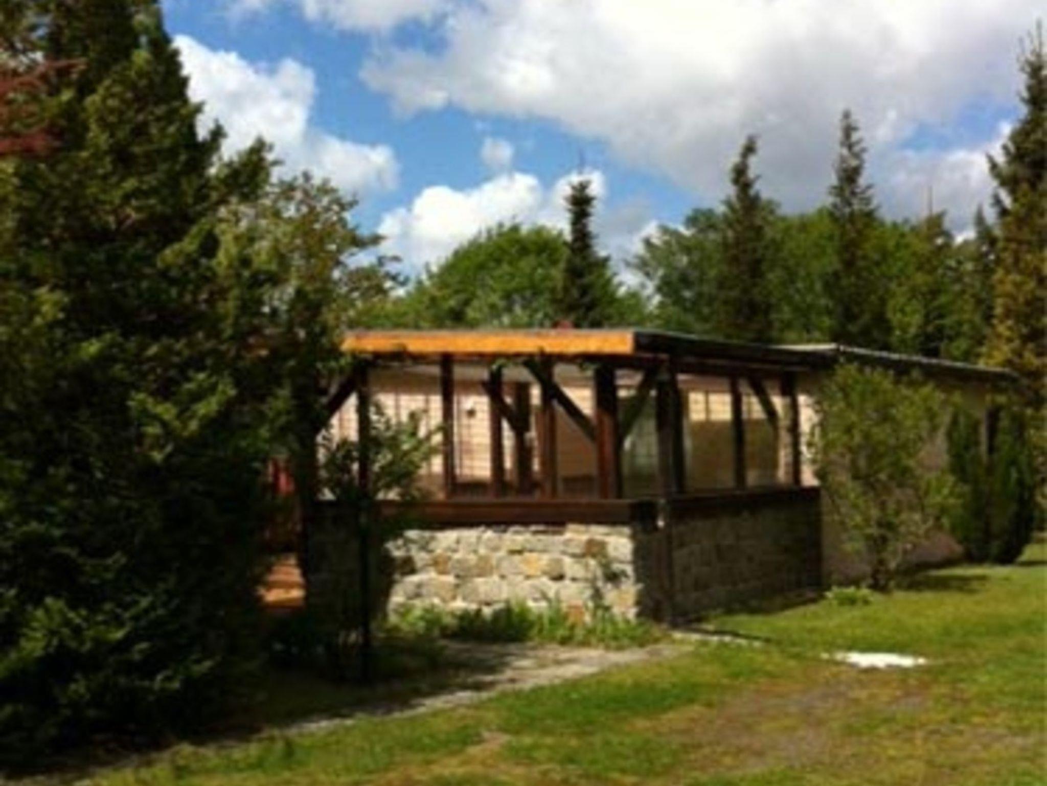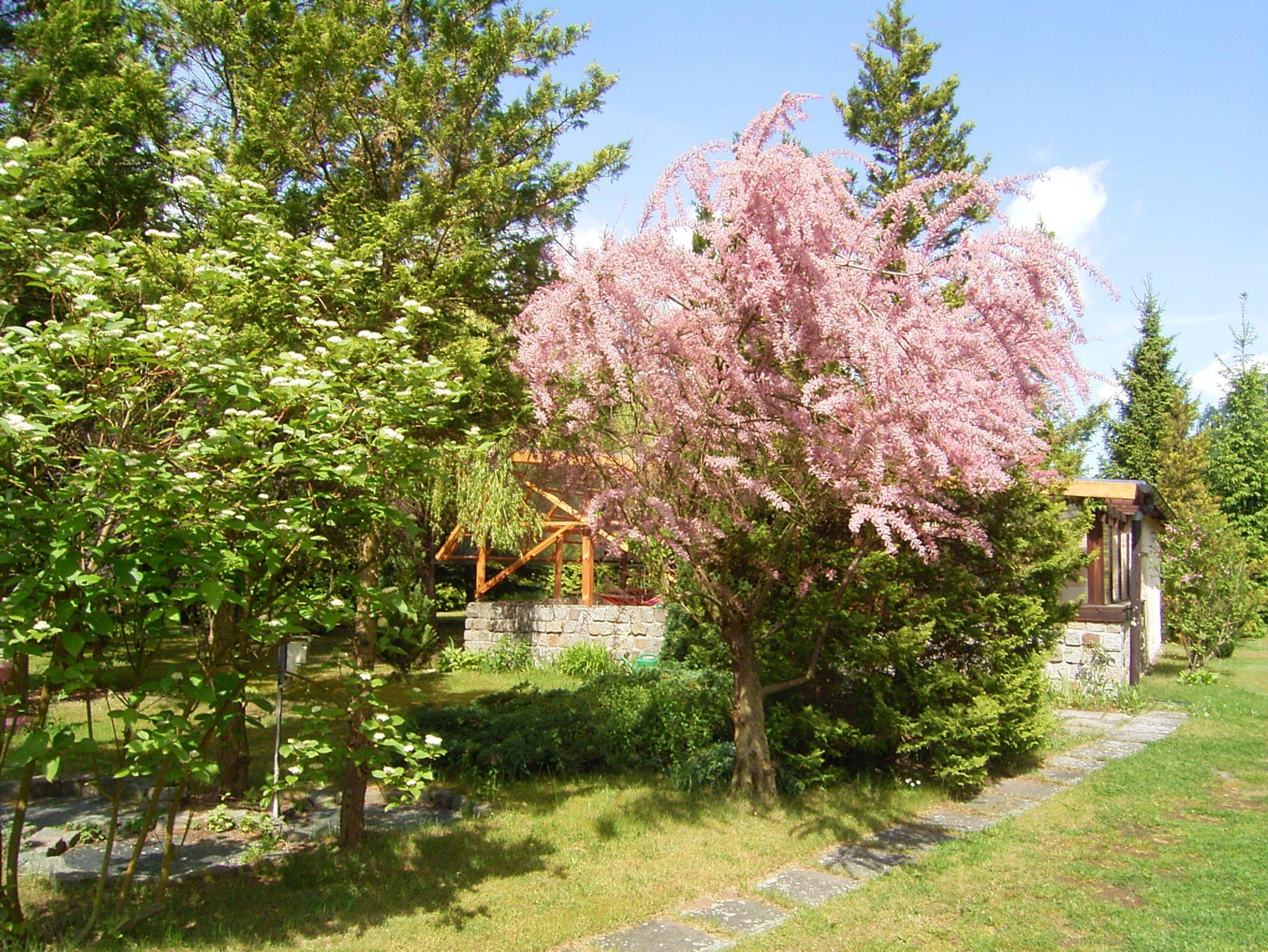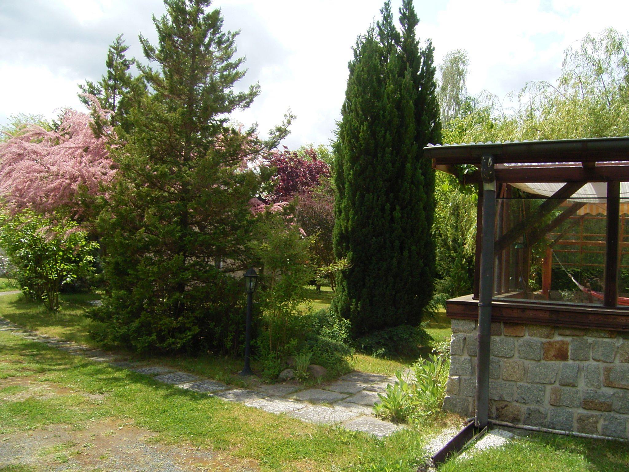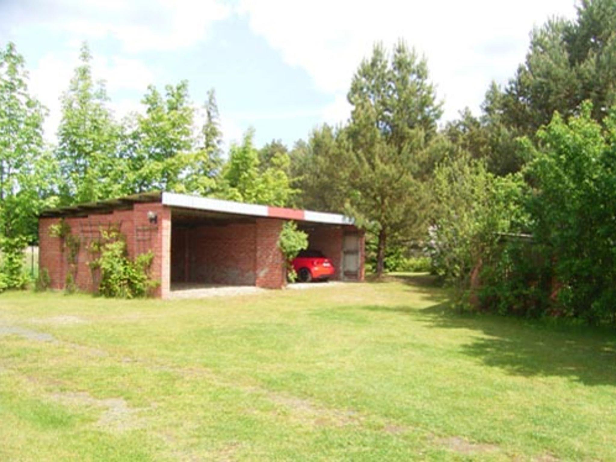 In der Nähe eines Bahnübergangs idyllisch am Waldrand gelegener, modern eingerichteter Bungalow, in großer gepflegter Gartenanlage (5000 m²), durch Hecken und Gebüsch vom Haupthaus abgegrenzt, in dem der Eigentümer wohnt.