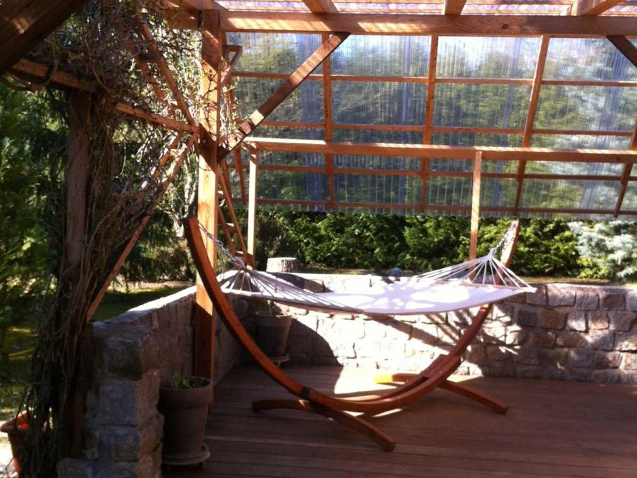 überdachte Terrasse mit Sitzecke und Hängematte, Wäscheständer