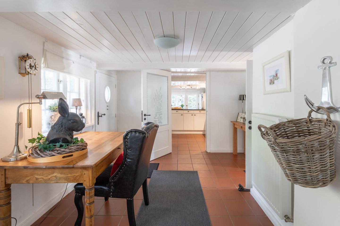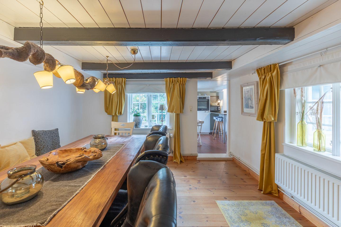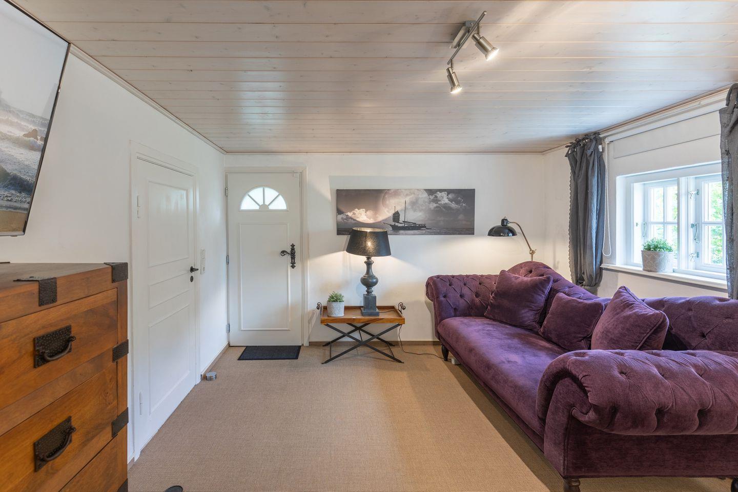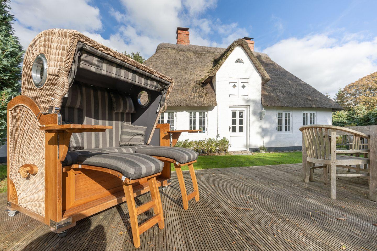 Exklusives Landhaus für bis zu 6 Personen in Humptrup. 160 qm, 3 Schlafzimmer mit Boxspringbetten, gut ausgestattete Küche, gemütliches Esszimmer, Wohnzimmer mit Flachbild-TV und Kamin, Holzterrasse im parkähnlichen Garten, Saunawagen (gegen Gebühr), Hunde willkommen, großer eingewachsener, eingezäunter Garten, kostenloses WLAN, Parkplätze. Nichtraucher. Hinweis für großgewachsene Gäste: 1,85 m bis 2,10 m Deckenhöhe, 1,70 m Durchgangshöhe in einer Tür.