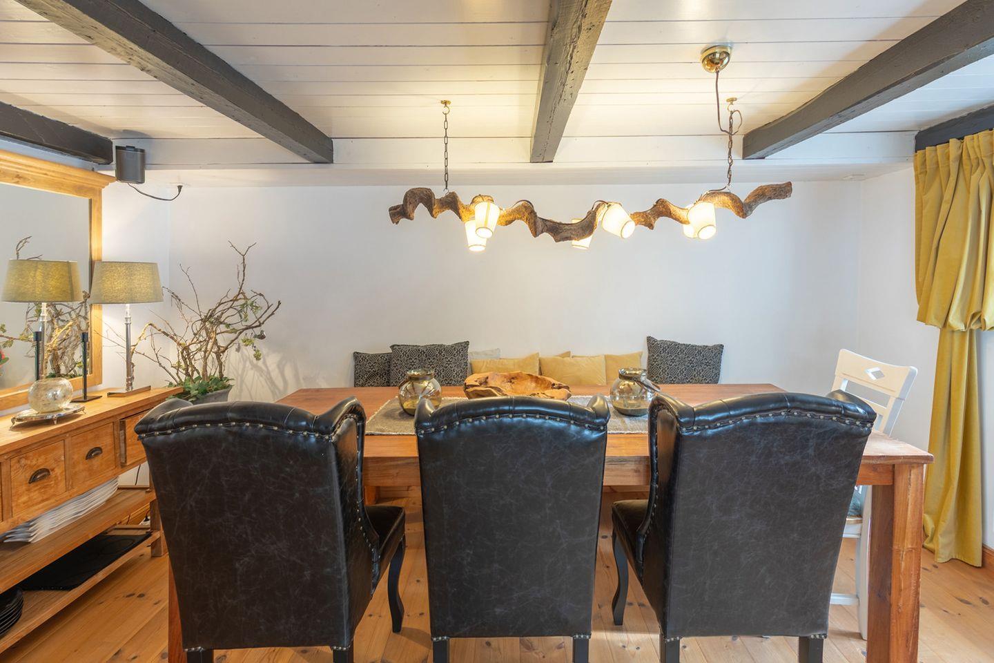 Das gemütliche und mit einer großzügigen Tafel ausgestattete Esszimmer bietet ausreichend Platz für alle Köstlichkeiten, die Sie in der Küche zubereitet haben, und lädt zu genussvollen Stunden ein.