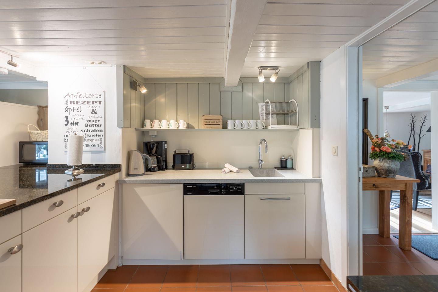 Zum Ferienhaus gehören eine hervorragend ausgestattete Küche mit Geschirrspüler, Waschmaschine, Kühlschrank und großem Gefrierschrank, Backofen, Ceranfeld mit 4 Kochplatten, Dunstabzugshaube, Filterkaffee-Maschine (Filtergröße 4), Wasserkocher, Küchenmaschine, Mikrowelle, Waffeleisen, Pürierstab und Toaster.