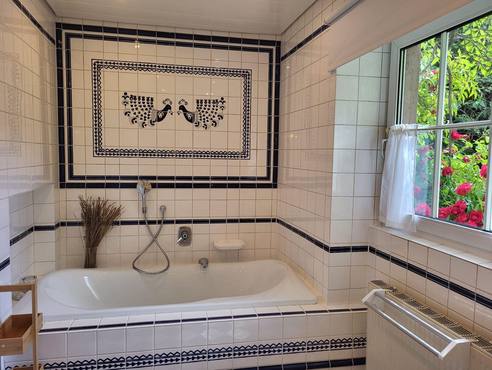 In einer ruhigen Seitenstraße gelegen, schließt sich an das historische Landhaus eine weitläufige Weidelandschaft mit Obstbäumen und einer heimischen Tierwelt an. Der Innenhof bietet einen geschützten Rückzugsort für ein Frühstück in der Morgensonne, zum Grillen am Abend oder für gemeinsame Spiele mit Kindern (Federball, Basketball, Boule, Brettspiele etc. sind vorhanden).