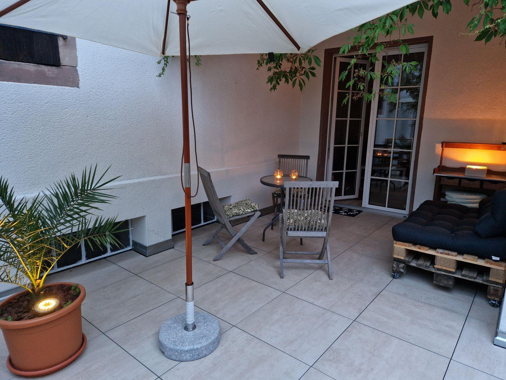 Zur Straßenseite bildet die Wohnung den 1. Stock des Hauses und ist damit von der Straße nicht unmittelbar einsehbar. Zu dem nach hinten liegenden, blickgeschützten und begrünten Innenhof gelangt man direkt über die Terrasse der Wohnung.