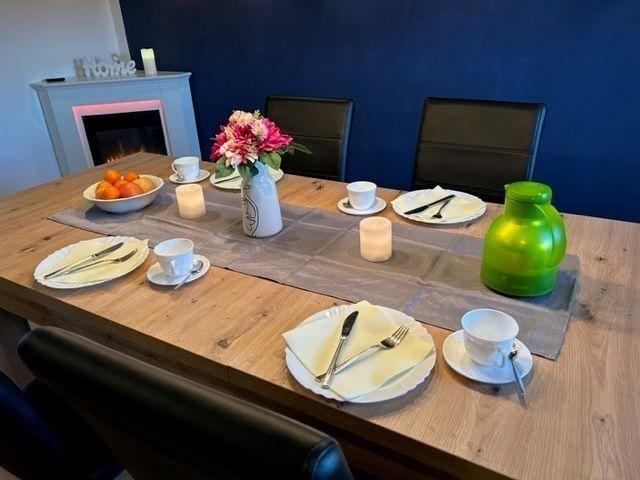 Unsere voll ausgestattete Küche bietet alles, was Sie für Ihre Mahlzeiten benötigen: Herd, Backofen, Kühlschrank, Gefrierfach, Kaffeemaschine, Wasserkocher und Toaster. Geschirr, Besteck und Kochutensilien stehen ebenfalls zur Verfügung. Der angrenzende Essbereich bietet Platz für gemeinsame Mahlzeiten in entspannter Runde.