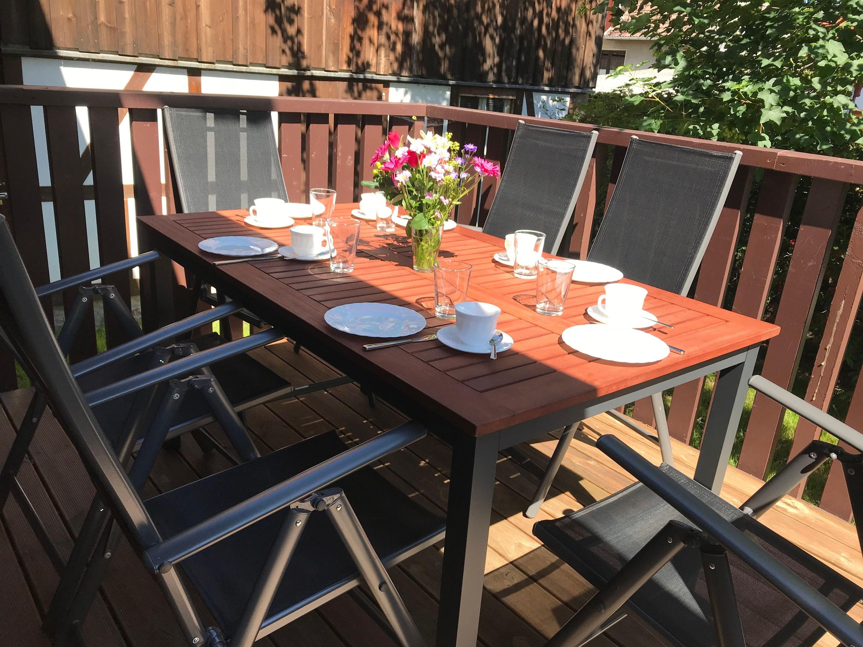 Terrasse: Zugang von der Küche aus, mit Sitzmöbeln und einem Grill.