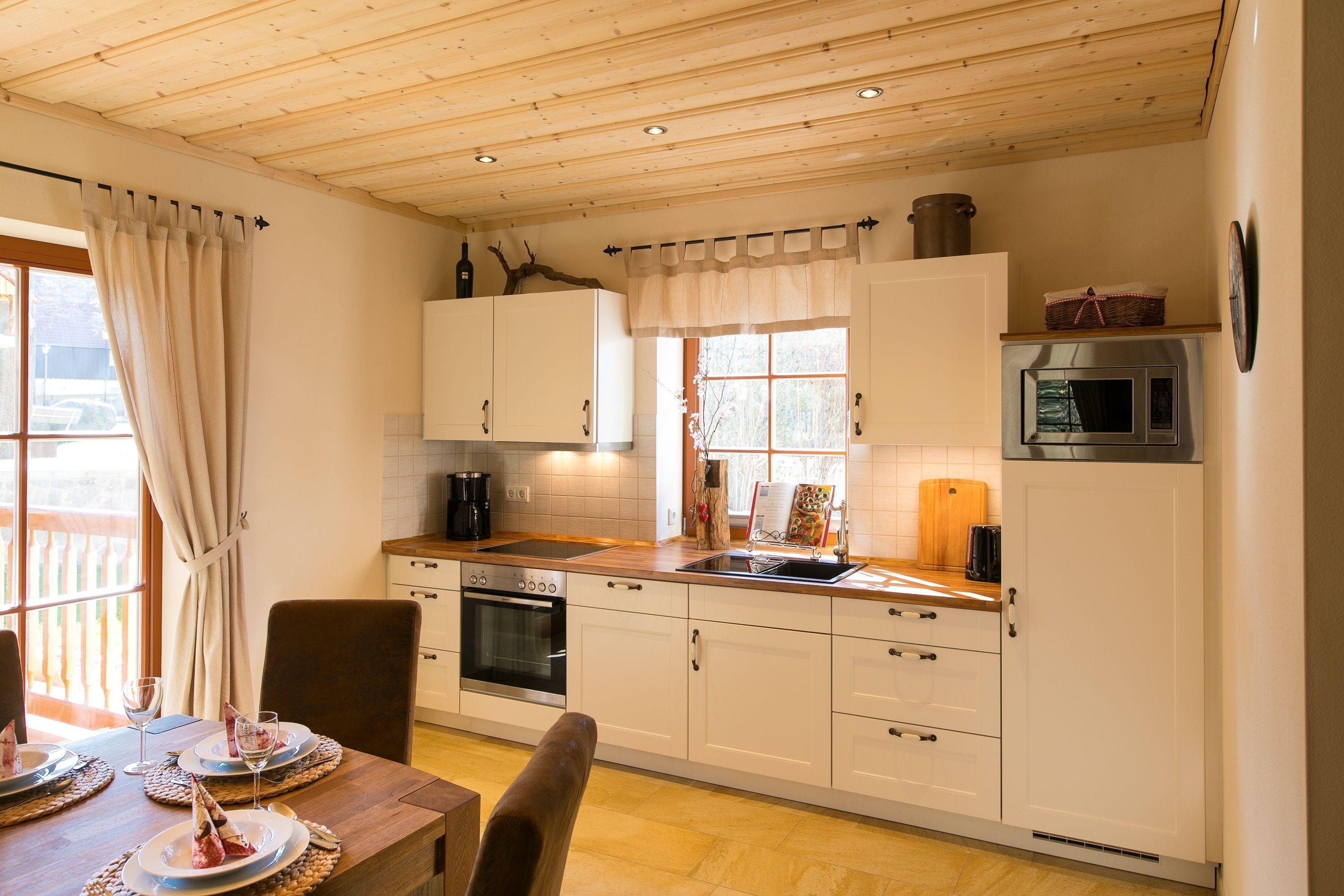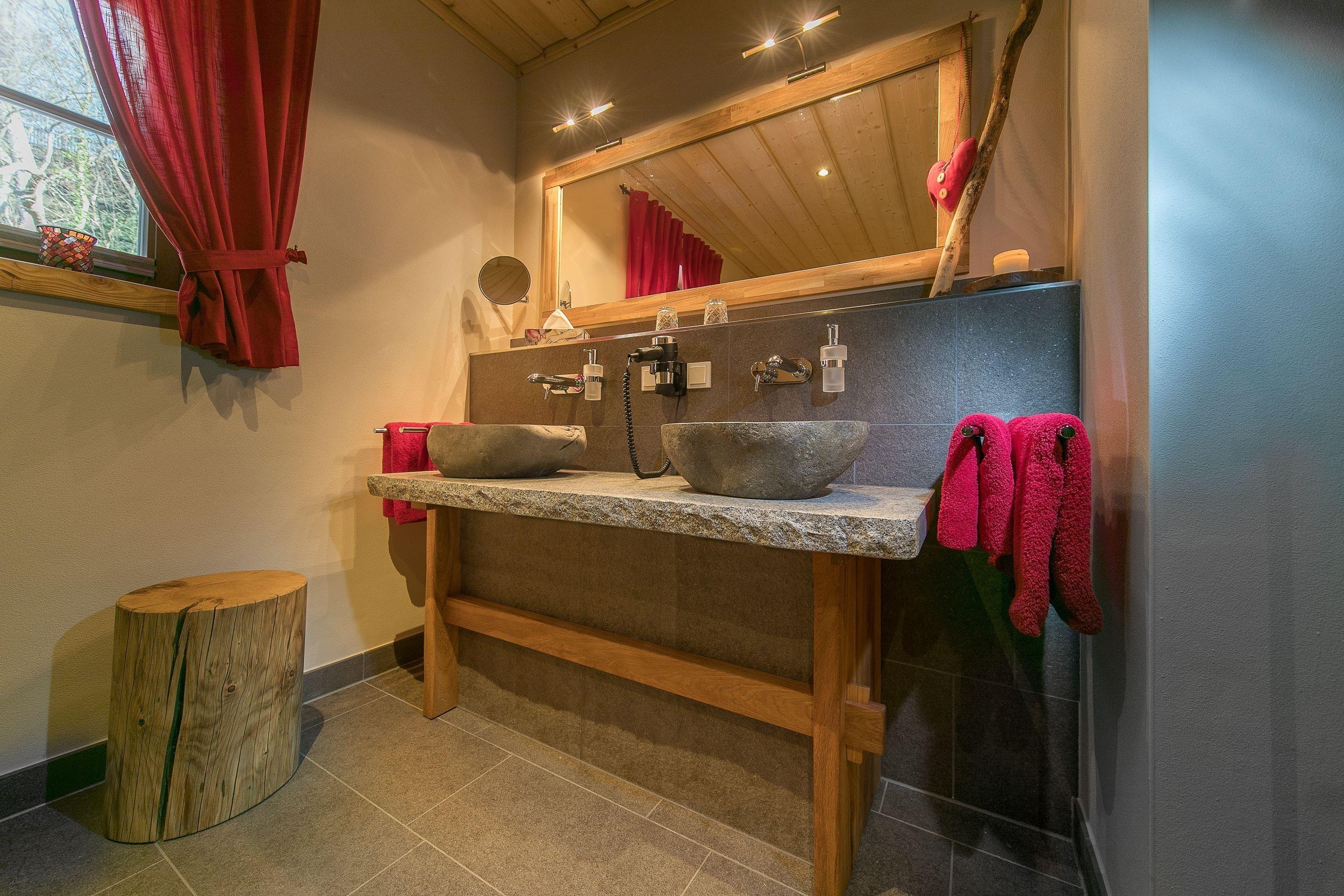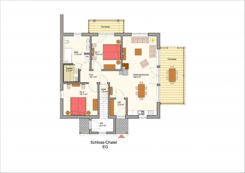 Das Schloß-Chalet hat 2 großzügig eingerichtete Schlafzimmer mit Doppelbetten und einer kleinen Terrasse,1 exklusives Bad mit Fußbodenheizung, Handtuchheizkörper, ebenerdigen Duscheinstieg und Natursteinwaschtisch mit 2 Natursteinwaschbecken, 1 finnische Trockensauna, einem urigen Wohn- und Essbereich mit gemauerten Kamin für gemütliche Stunden und einer großen überdachten Holzterrasse mit bequemen Holzmöbeln.