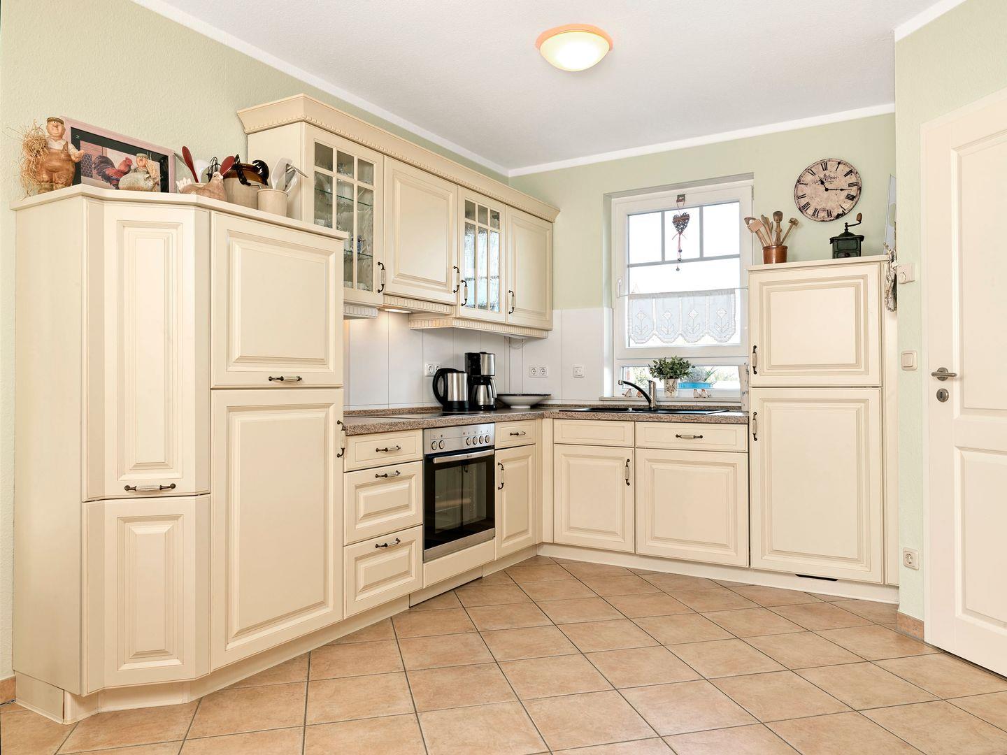 Im Erdgeschoss befindet sich der großzügige, lichtdurchfluteter, in warmen Farben eingerichtete Wohn-Eßbereich und offener Landhaus-Einbauküche.