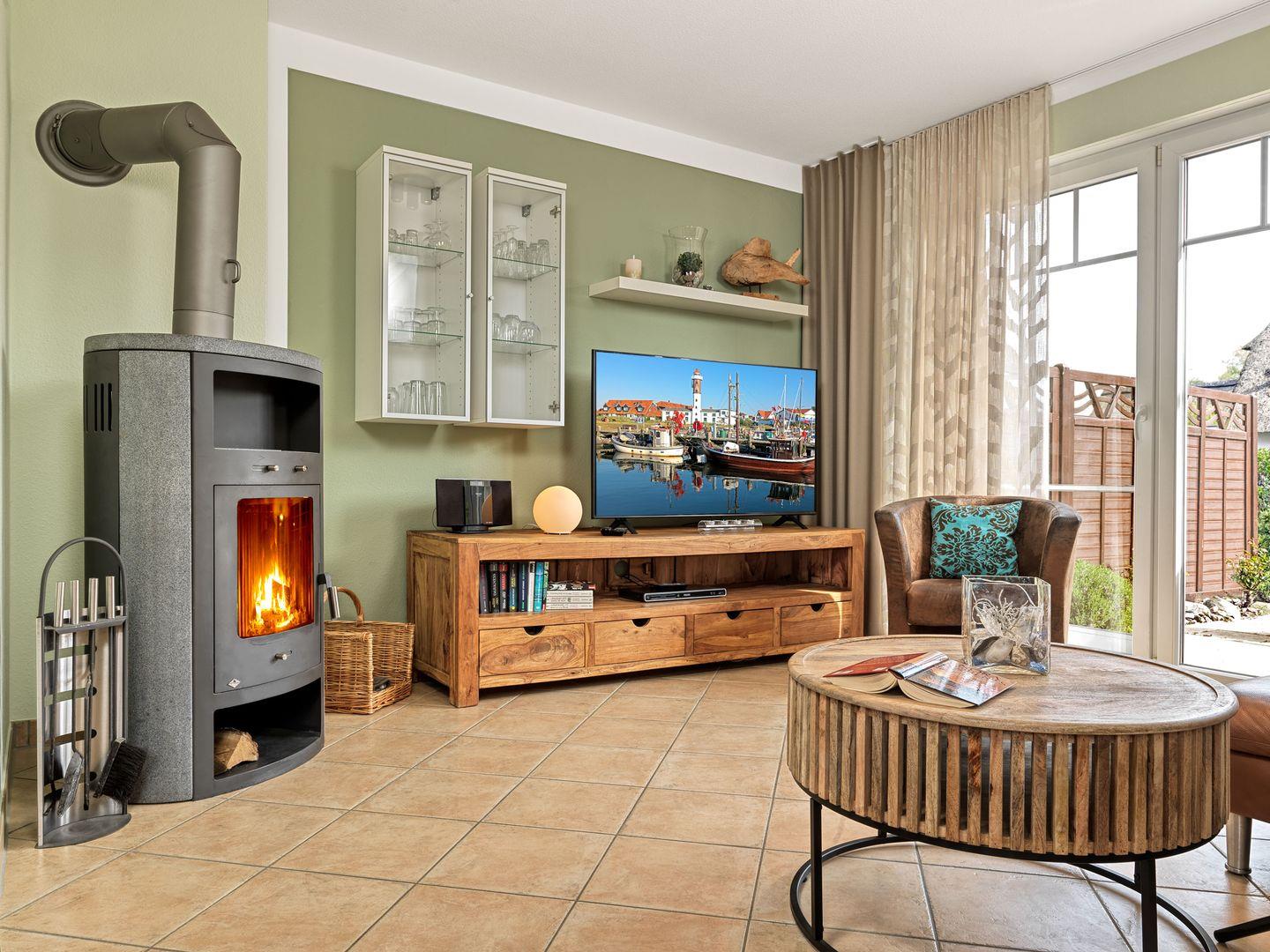 Vom Wohnzimmer mit Kaminofen, Flat-TV, DVD, HiFi, I-Pod-Anschluß aus haben Sie direkten Zugang zur Terrasse.