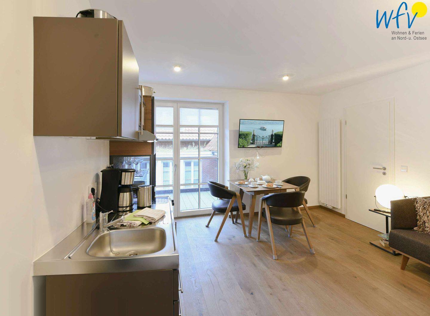 Damit Sie sich in Ihrem Urlaub auf Juist bequem selbst verpflegen können, verfügt die Küchenzeile u.a. über einen Herd mit Backofen, eine Spülmaschine, einen Kühlschrank mit Gefrierfach sowie über eine Kaffeemaschine, eine Mikrowelle und einen Wasserkocher.