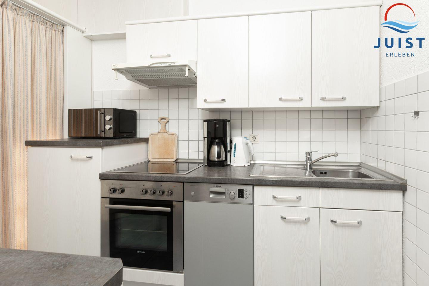 Die Wohnung hat zunächst beim eintreten einen kleinen Vorflur, von hier aus gehen sie in die moderne Küche. Diese ist ausgestattet mit 4-Platten-Ceranfeld, Backofen, Spülmaschine, Mikrowelle, Kühlschrank mit Gefrierschrank, Kaffeemaschine und Toaster.