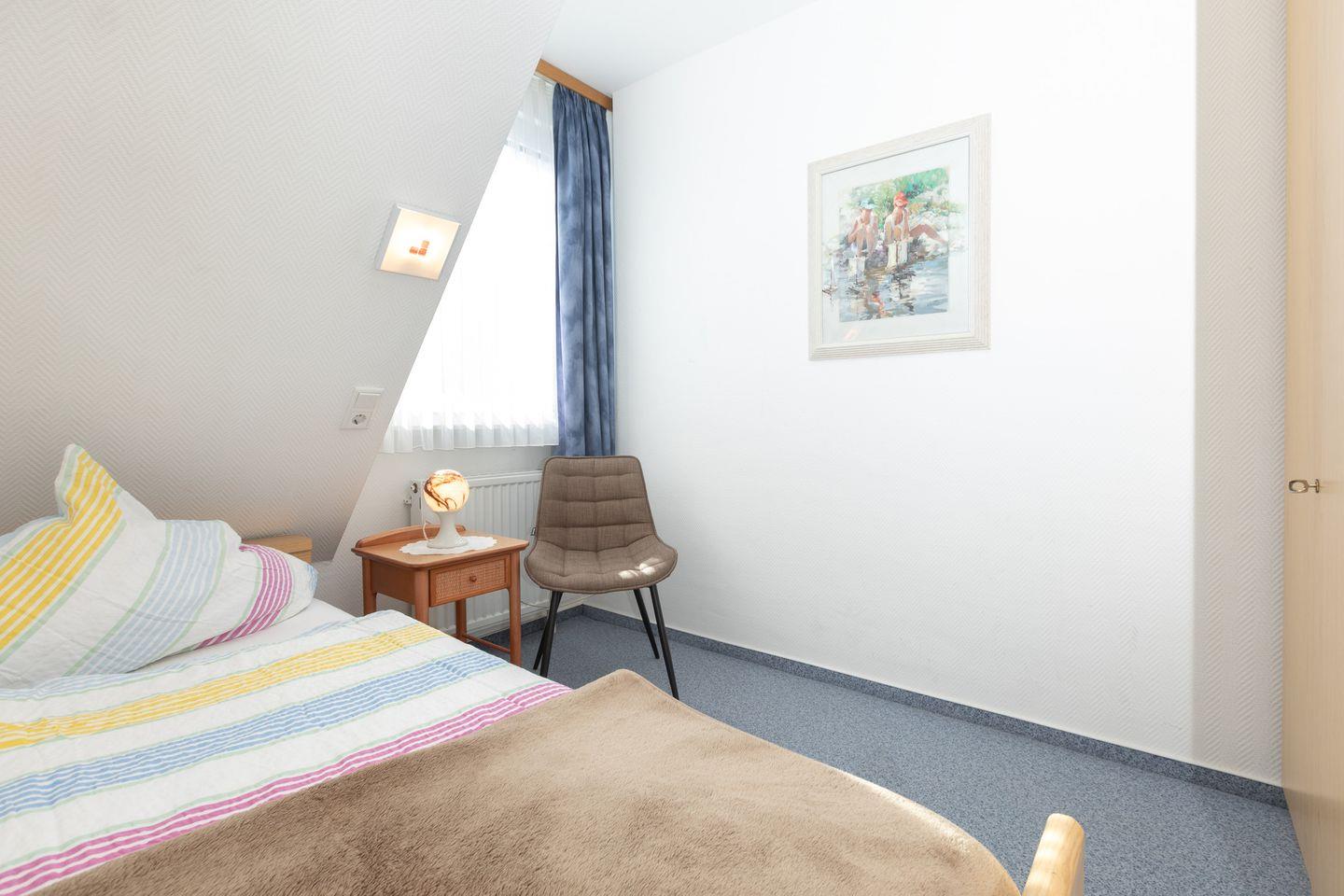 Das einzige separate Schlafzimmer der Ferienwohnung ist mit einem Einzelbett ausgestattet.