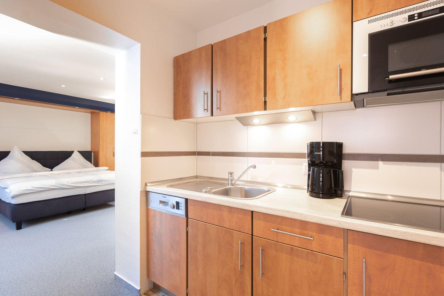 Die Küchenzeile ist ausgestattet mit 4-Platten-Ceranfeld, Spülmaschine, Mikrowelle, Kühlschrank mit Gefrierschrank, Kaffeemaschine und Toaster.