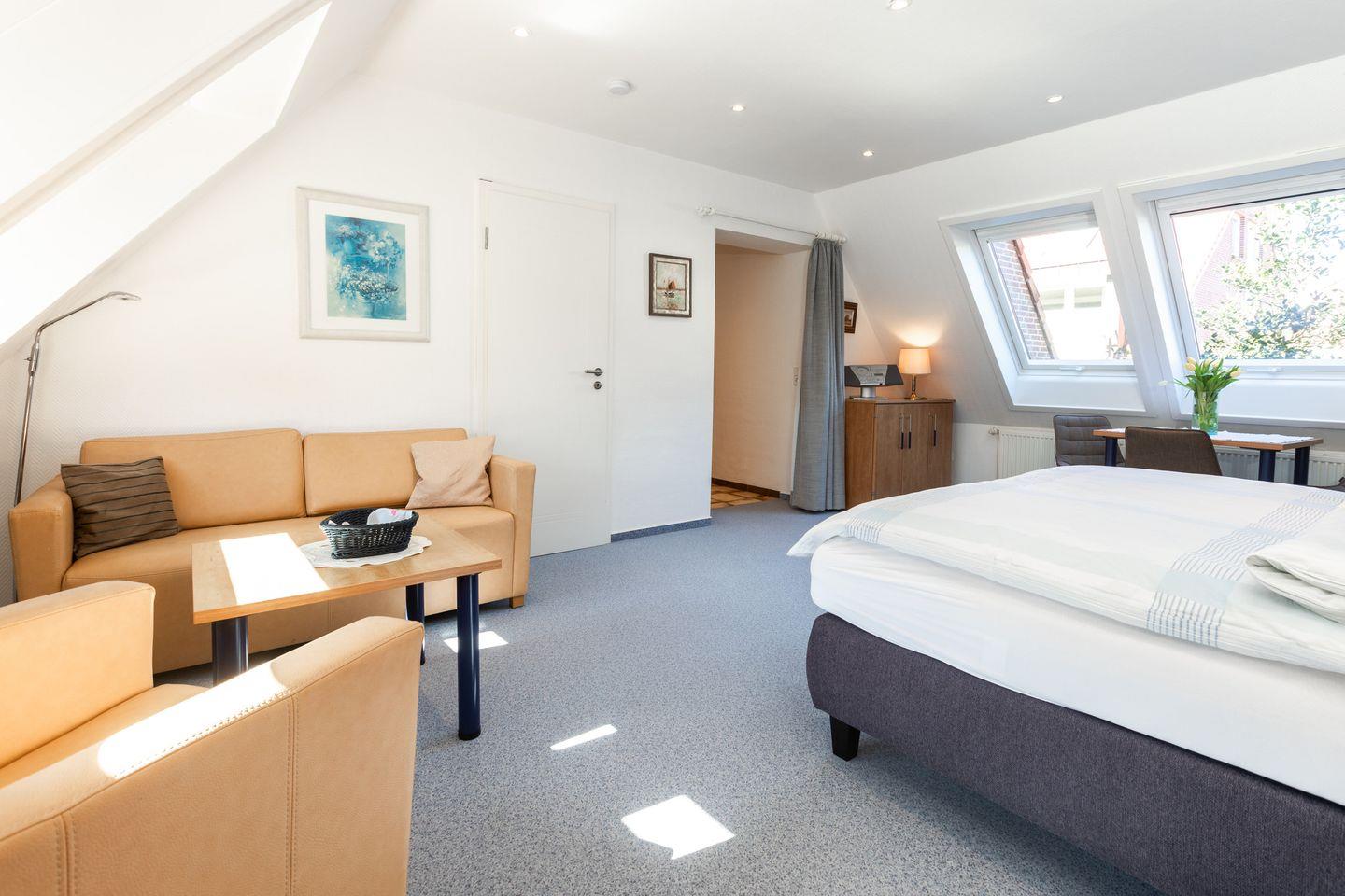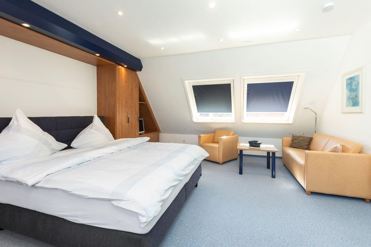 Die Wohnung verfügt über einen großzügigen hellen Wohnraum mit Boxspringbett, Couchecke und Essbereich, separater Küchenzeile, sowie ein weiteres extra Schlafzimmer und ein Duschbad mit Fenster.