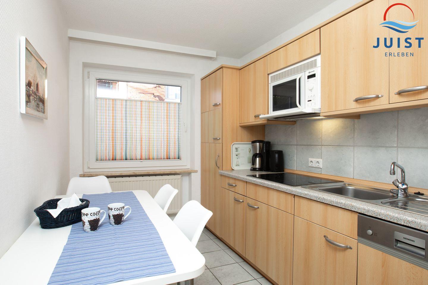 Die Küche mit Essbereich ist mit 4-Platten-Ceranfeld, Spülmaschine, Mikrowelle, Kühlschrank mit Gefrierschrank, Kaffeemaschine und Toaster ausgestattet.