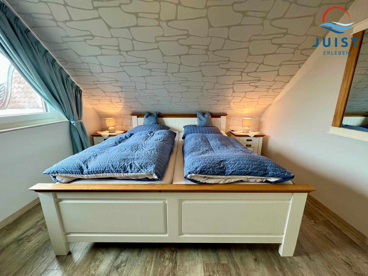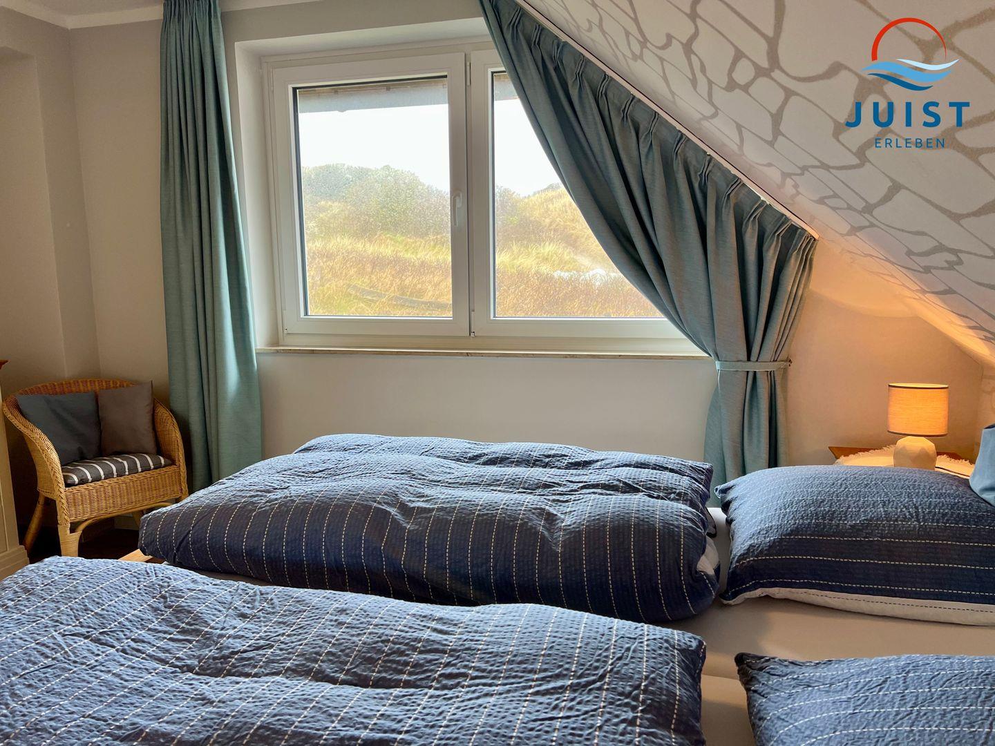 Das großzügige Doppelschlafzimmer ist mit einem Doppelbett und Kleiderschrank ausgestattet. Der Blick führt in die Dünenlandschaft. Das Zweibettzimmer verfügt über 2 Einzelbetten.