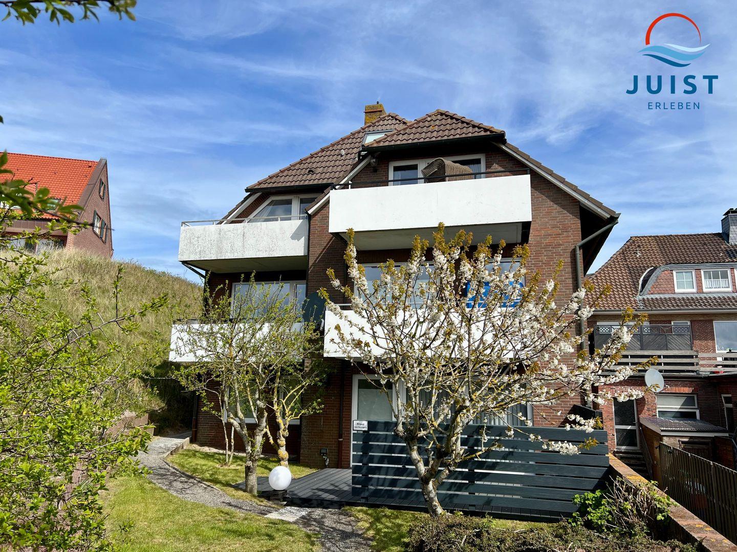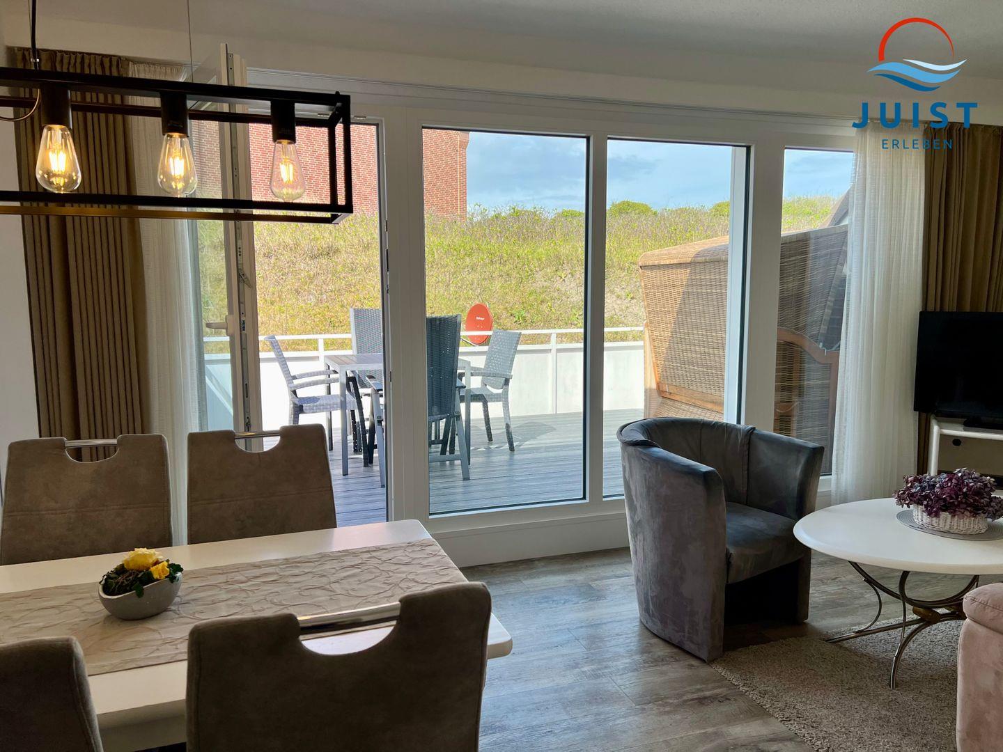 Auf ca. 60 m2 finden bis zu 4 Personen Platz. Auf dem großzügigem Balkon mit Strandkorb und Blick in die Dünen können sie sich gut erholen.