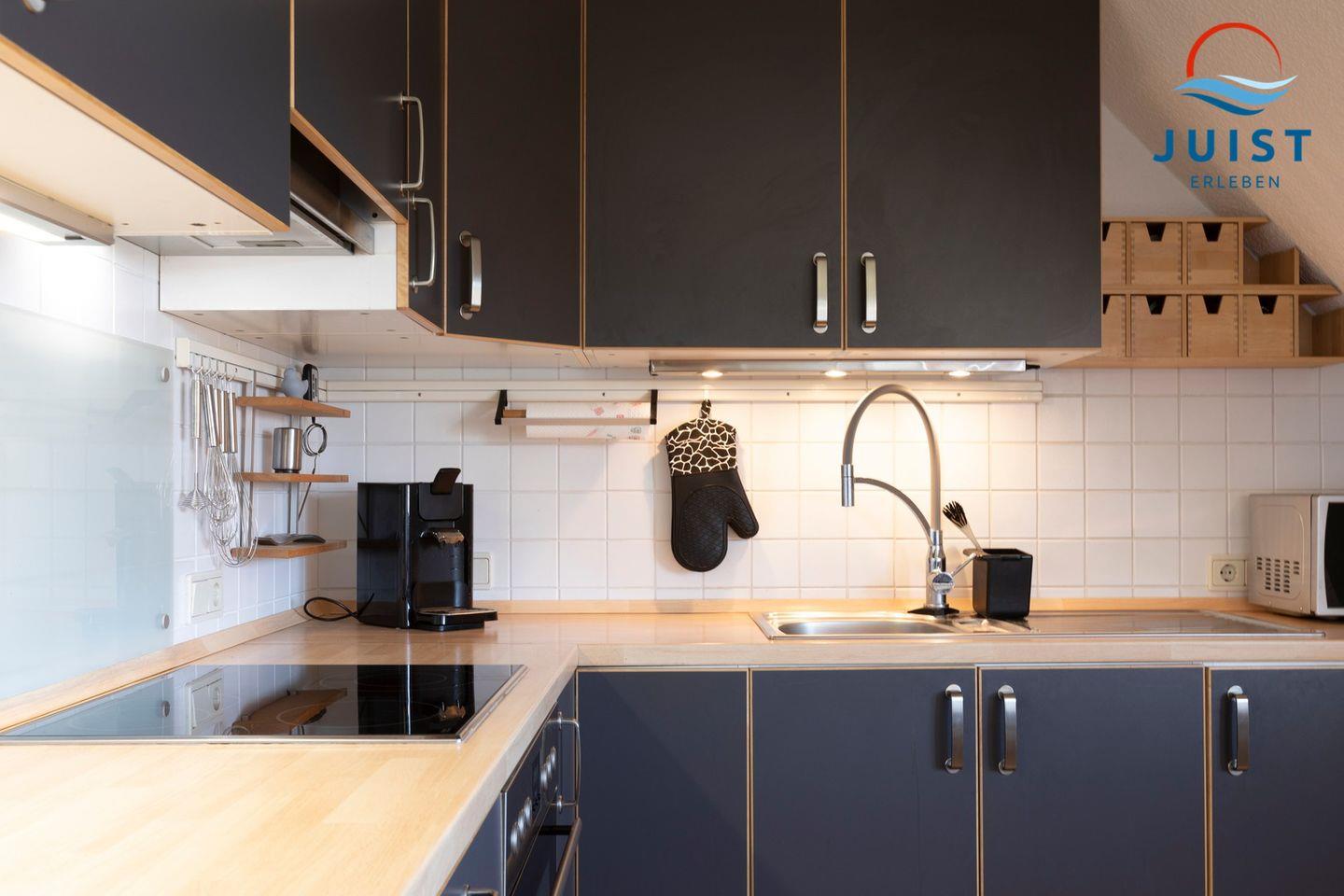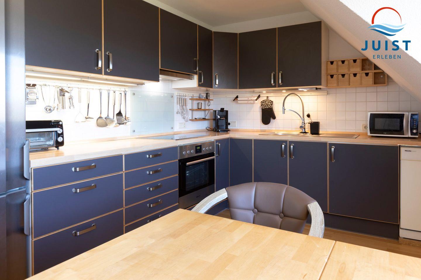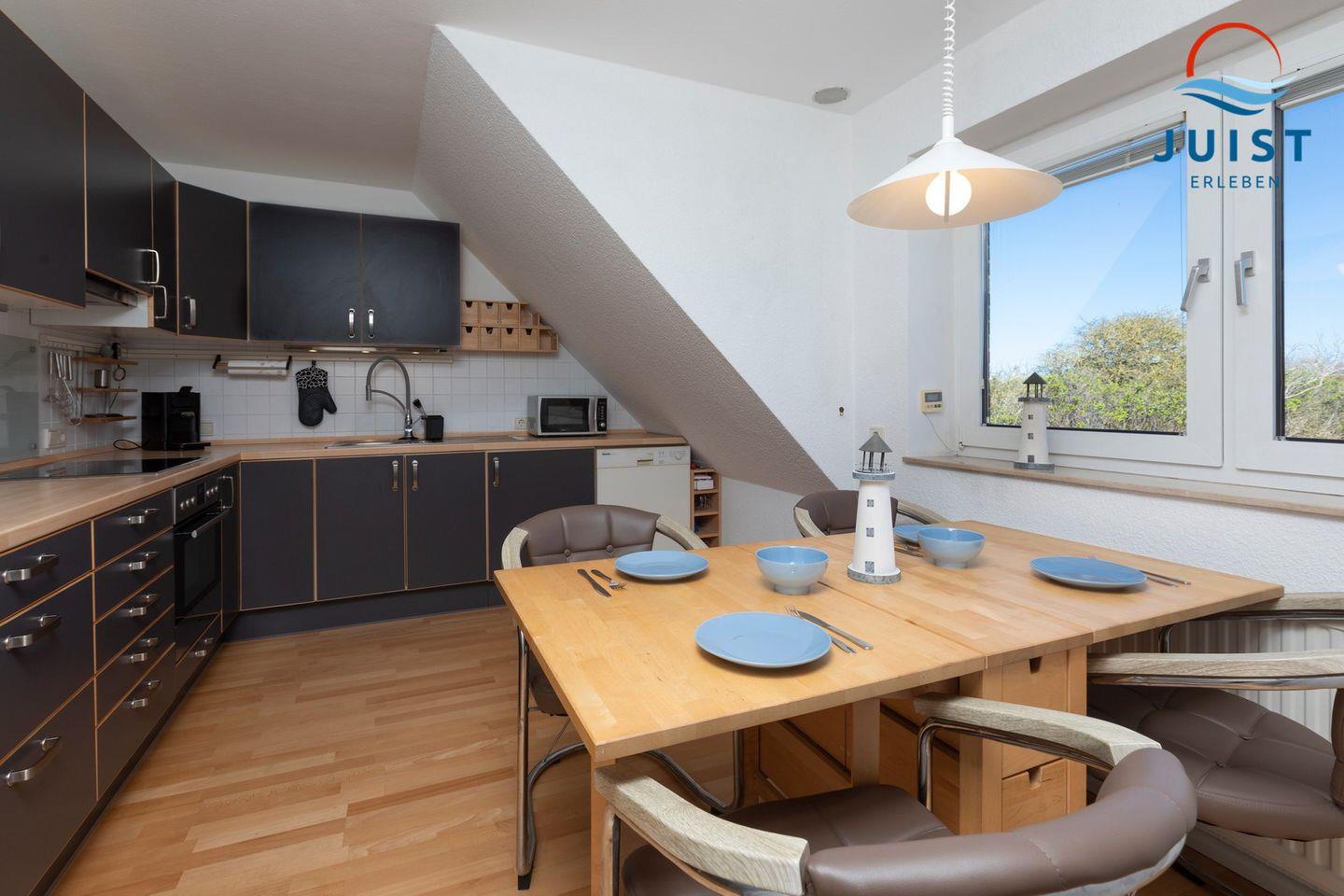 Die Küche gibt Ihnen die Möglichkeit, sich während Ihres Urlaubs auf Juist selbst zu verpflegen. Mit einem 4-Platten Ceran Herd, Kühlschrank, Gefrierschrank, Geschirrspülmaschine, Toaster, Eierkocher und Kaffeemaschine haben Sie alles, was Sie für die Zubereitung von Mahlzeiten benötigen.
