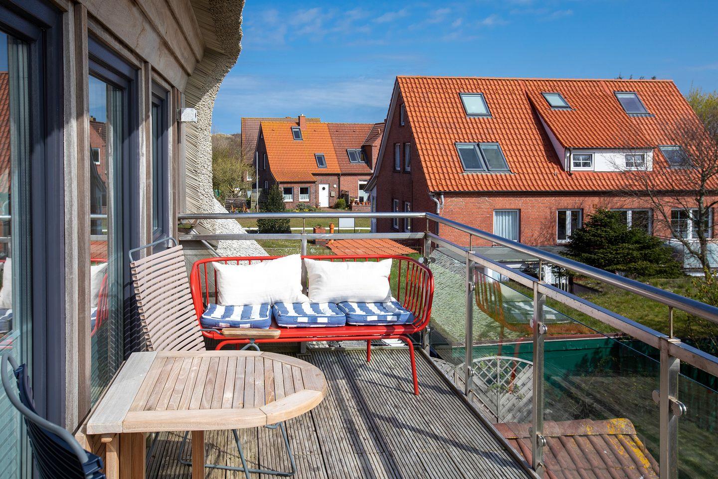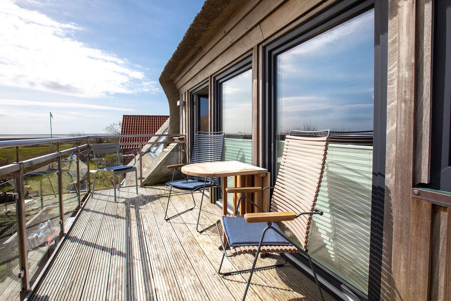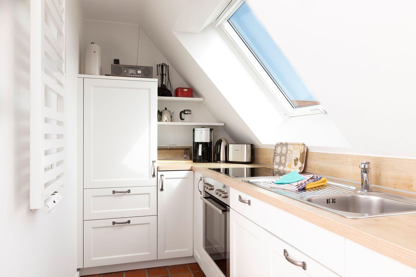 Der Wohn-Ess-Bereich, sowie der Balkon (ca 8m² ) liegen auf der Ostseite zum hauseigenen Garten und Wattenmeer hin. Die integrierte Küchenzeile ist mit 4-Felder Ceranherd und Backofen, sowie Kühlschrank mit TK-Fach, Spülmaschine, Toaster, Kaffeefiltermaschine und Küchentüchern ausgestattet.