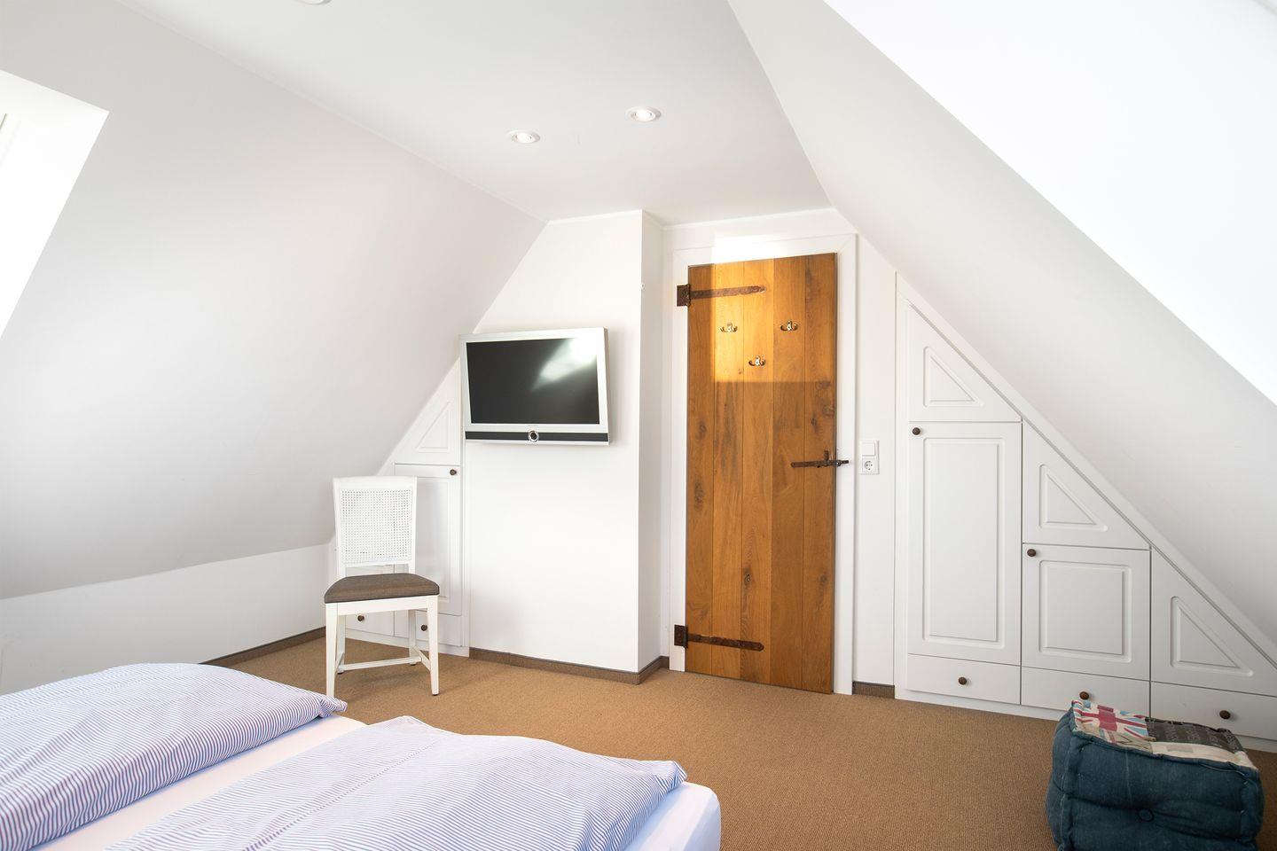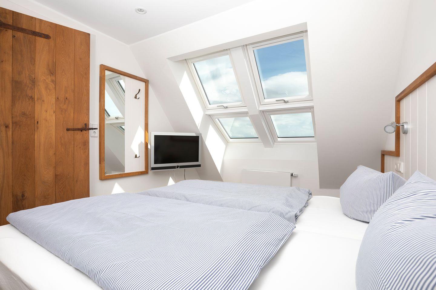 Die beiden Schlafzimmer im Dachspitz sind jeweils mit einem Doppelbett ausgestattet, welche sich auch in Einzelbetten umfunktionieren lassen. Bei Bedarf kann ein Zustell-Kinderbett bereitgestellt werden.