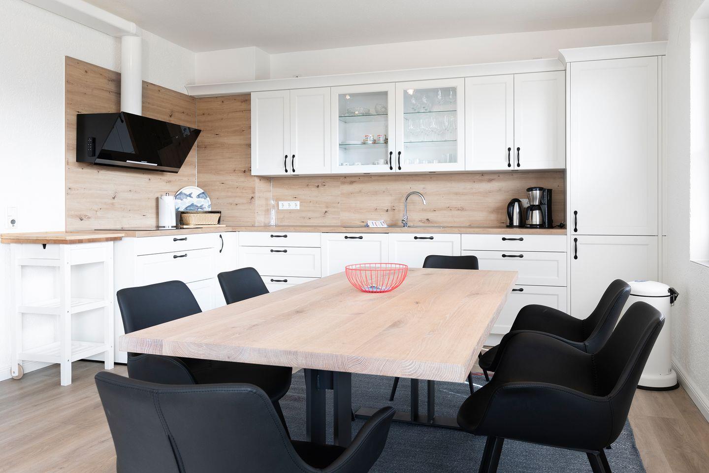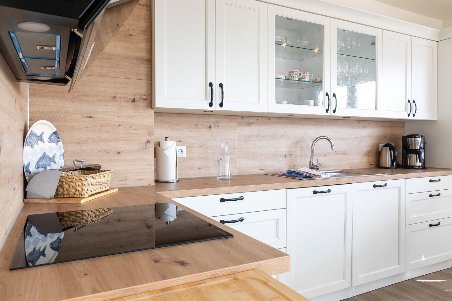 Die offene Wohnküche ist mit einem 4-Felder Ceranfeld, sowie Backofen und Mikrowelle, Kühlschrank, Gefrierschrank (3 Fächer), Spülmaschine, Toaster, Kaffeefiltermaschine und Küchentüchern ausgestattet.