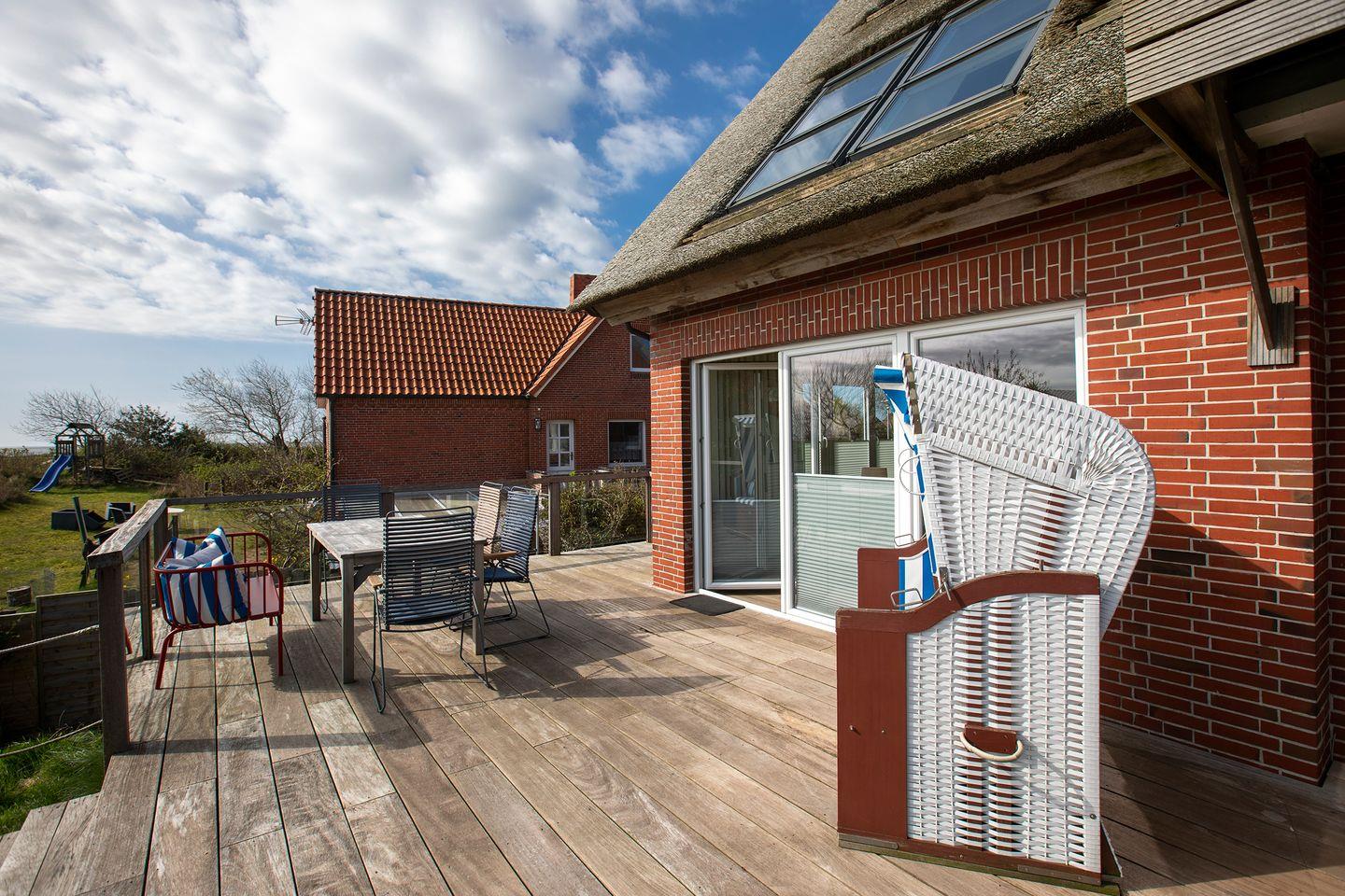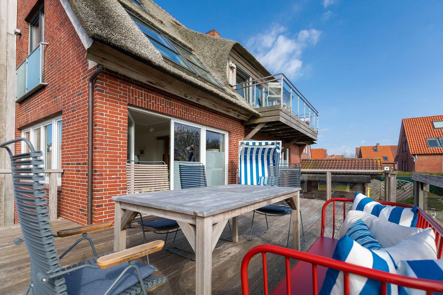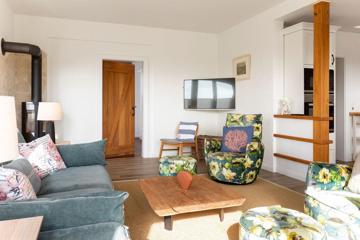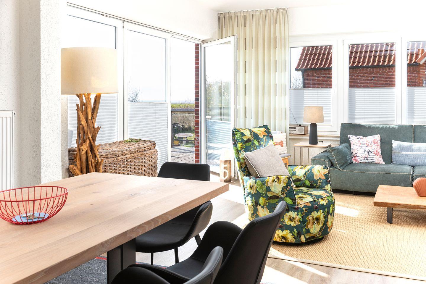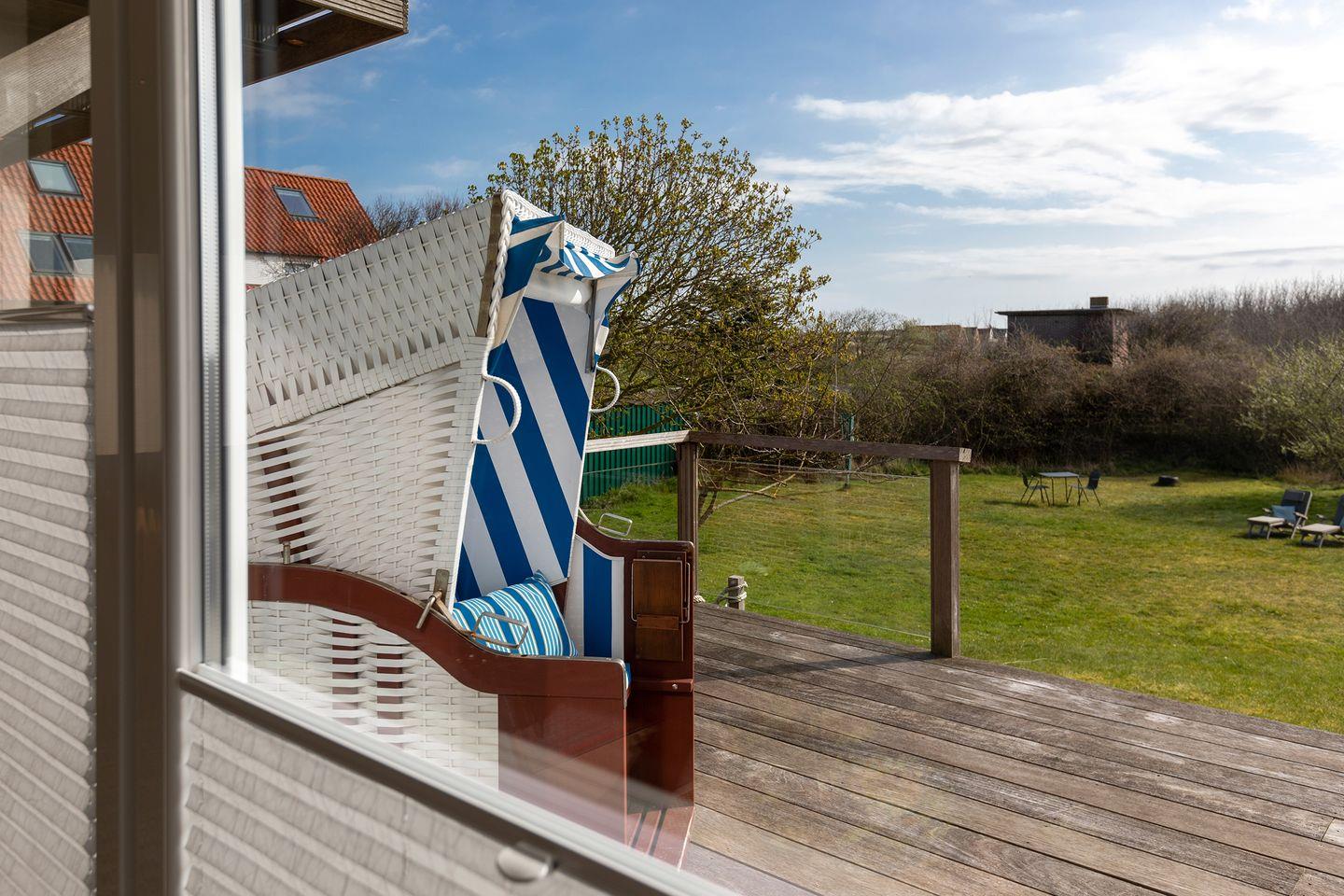 Vom angrenzenden Wohnraum mit Kamin tritt man auf die ostseitige Terrasse (ca 26m²) und den hauseigenen Garten, welcher allen Gästen von Haus Herzmuschel zur Benutzung frei zur Verfügung steht.