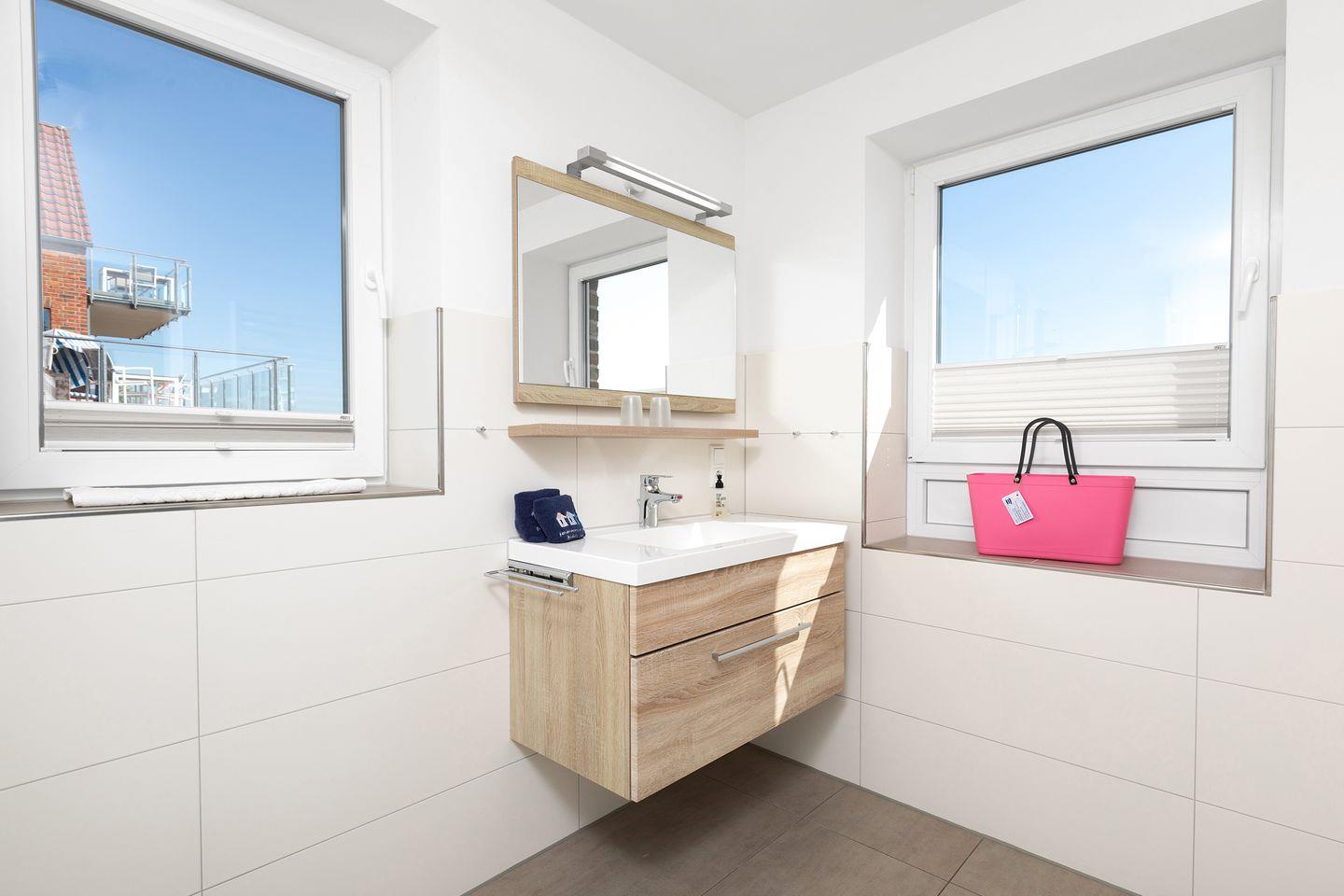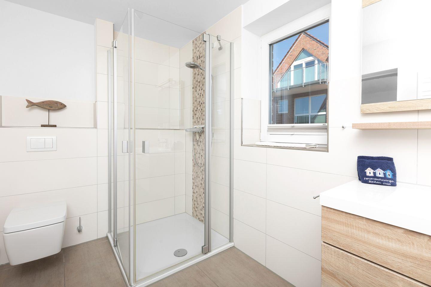 Das Bad ist mit einer Dusche ausgestattet. Grundsätzlich sind Fön sowie Handtücher/Duschtücher vorhanden.