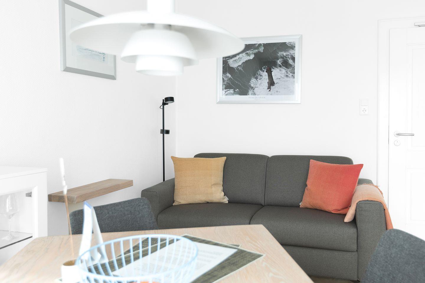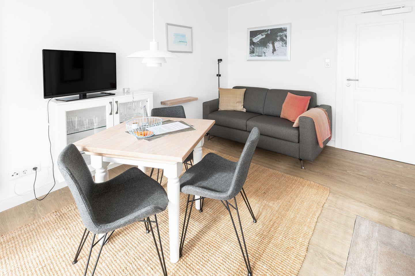 Der Wohn-Essbereich ist mit einer Küchenzeile ausgestattet. Diese verfügt über einen Herd mit 4 Ceranfeldern, Backofen, sowie Kühlschrank mit TK-Fach, Geschirrspüler, Wasserkocher, Toaster, Filterkaffeemaschine und Küchentüchern.