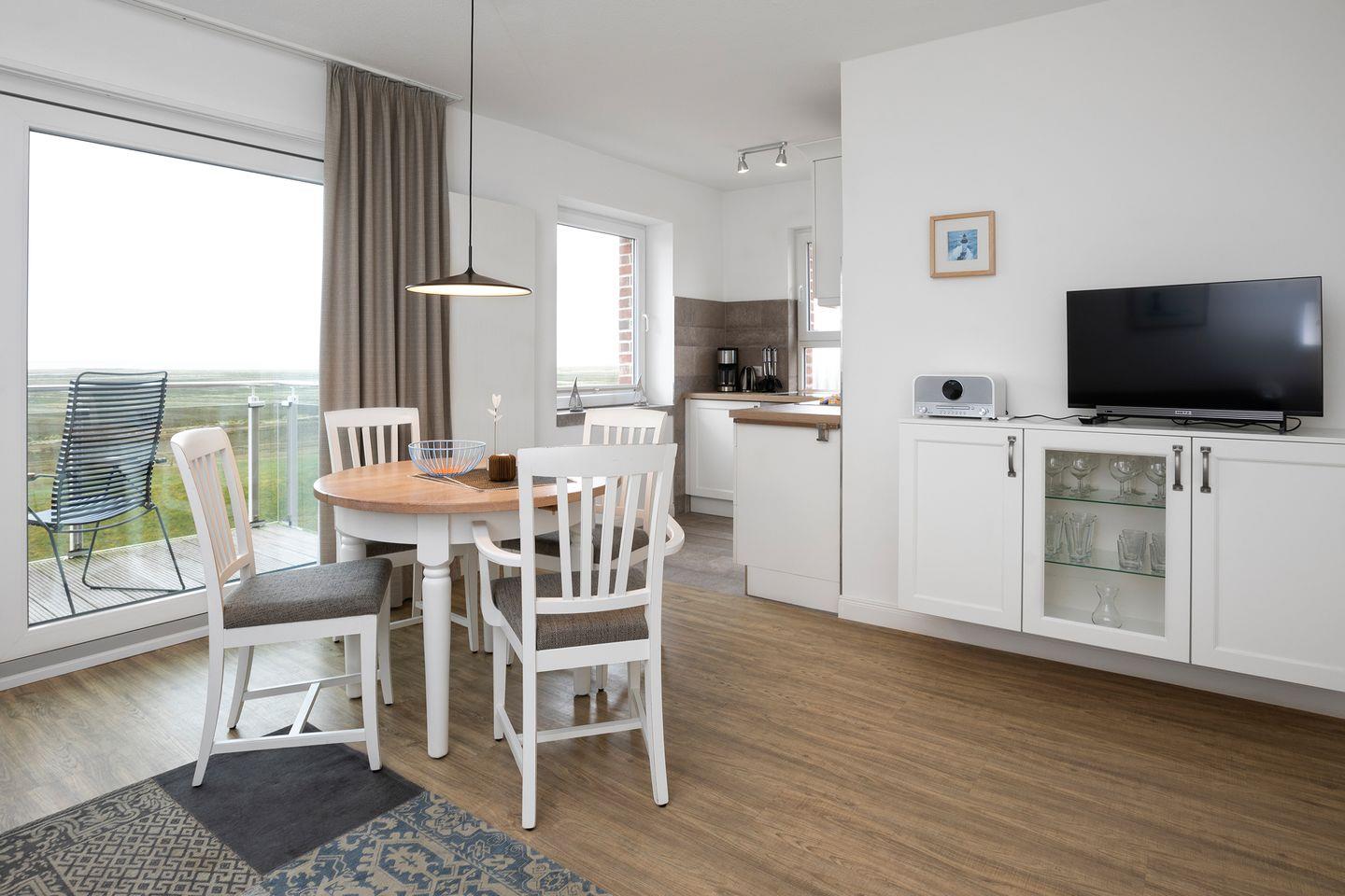 Mit einer Fläche von ca. 5m² bietet der südseitige Balkon einen Blick über Hellerwiesen und Wattenmeer.
