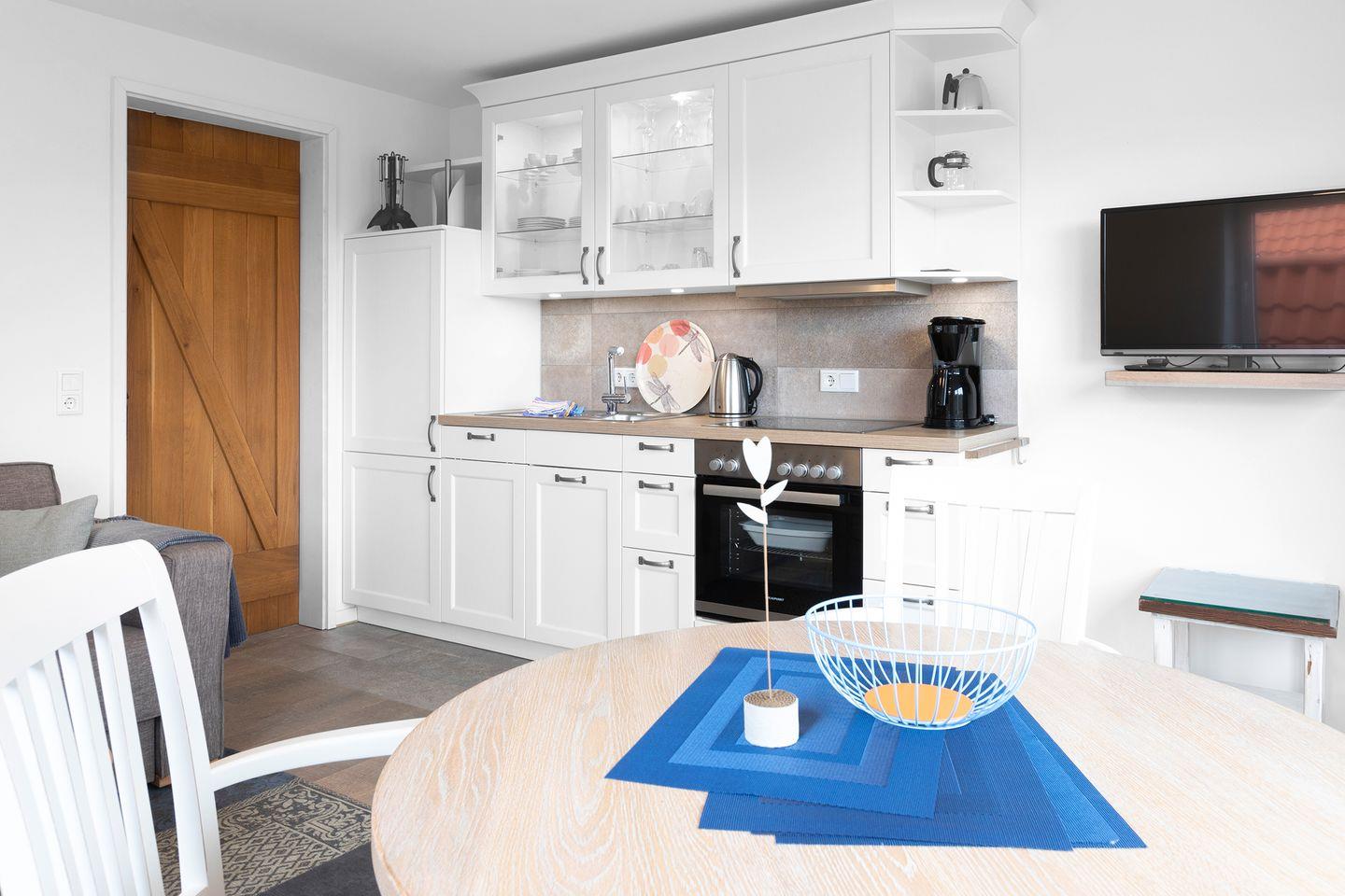 Im Wohn- Essbereich ist die Küchenzeile integriert. Diese verfügt über einen 4-Felder Ceranherd mit Backofen, Kühlschrank mit TK-Fach, Geschirrspüler, Wasserkocher, Toaster, Filterkaffeemaschine und Küchentüchern.