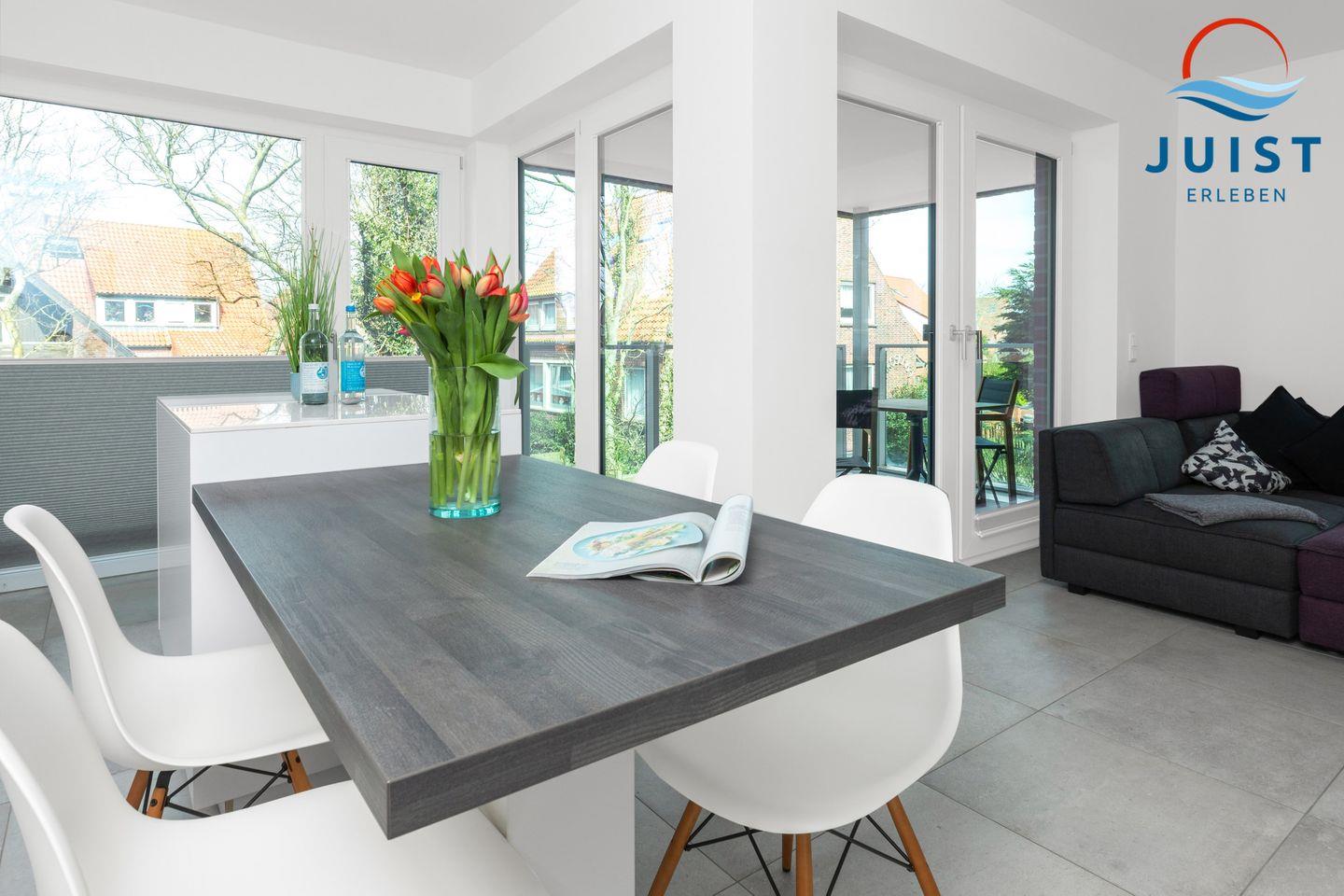 Der offene Wohn- und Essbereich im modernen Design lädt dazu ein, kostbare Zeit mit Ihrer Familie zu verbringen. Egal, ob Sie einen gemütlichen Fernsehabend genießen möchten oder gemeinsam köstliche Gerichte in der offenen Küche zubereiten - dieser moderne Wohnraum mit seiner bequemen Couchecke, dem TV und dem Esstisch bietet Ihnen zahlreiche Möglichkeiten für eine erholsame Urlaubszeit.