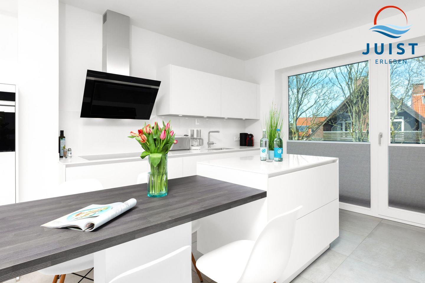 Die moderne Einbauküche ist komplett ausgestattet mit einem 4-Platten-Herd, Backofen, Geschirrspüler, Kühlschrank, Kaffeemaschine, Wasserkocher und Toaster, damit Sie auch im Urlaub schnell und einfach Gerichte zubereiten können.