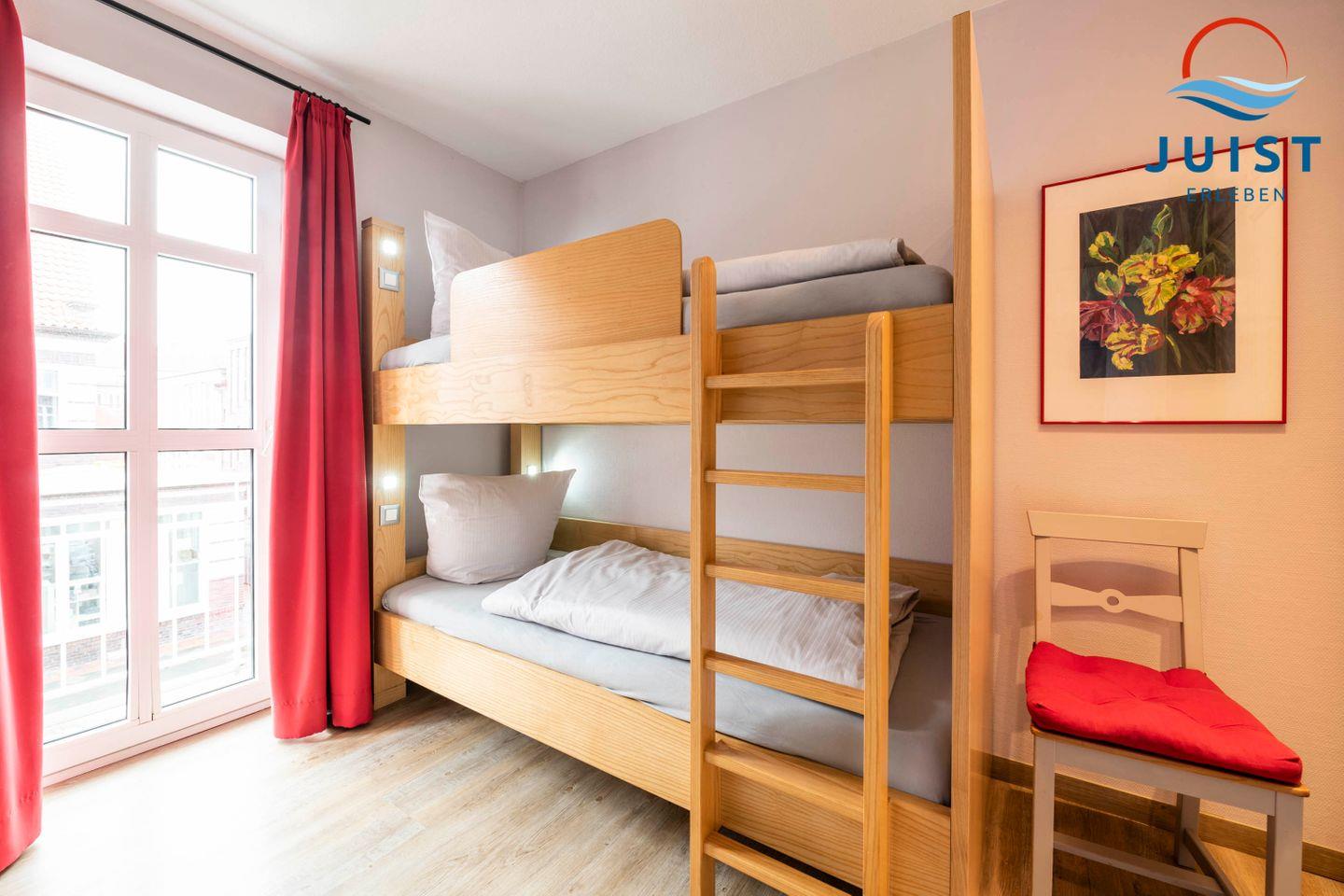 Die liebevoll ausgestattete Wohnung 102 in der Strandburg bietet Platz für bis zu 4 Personen und ist ideal für Familien. Die lichtdurchfluteten Räume bestehen aus einem Wohn- und Schlafraum mit einem komfortablen Doppelbett (fußfrei für größere Menschen) sowie einem separaten Zimmer mit Etagenbett, einer Kochnische und einem Duschbad.