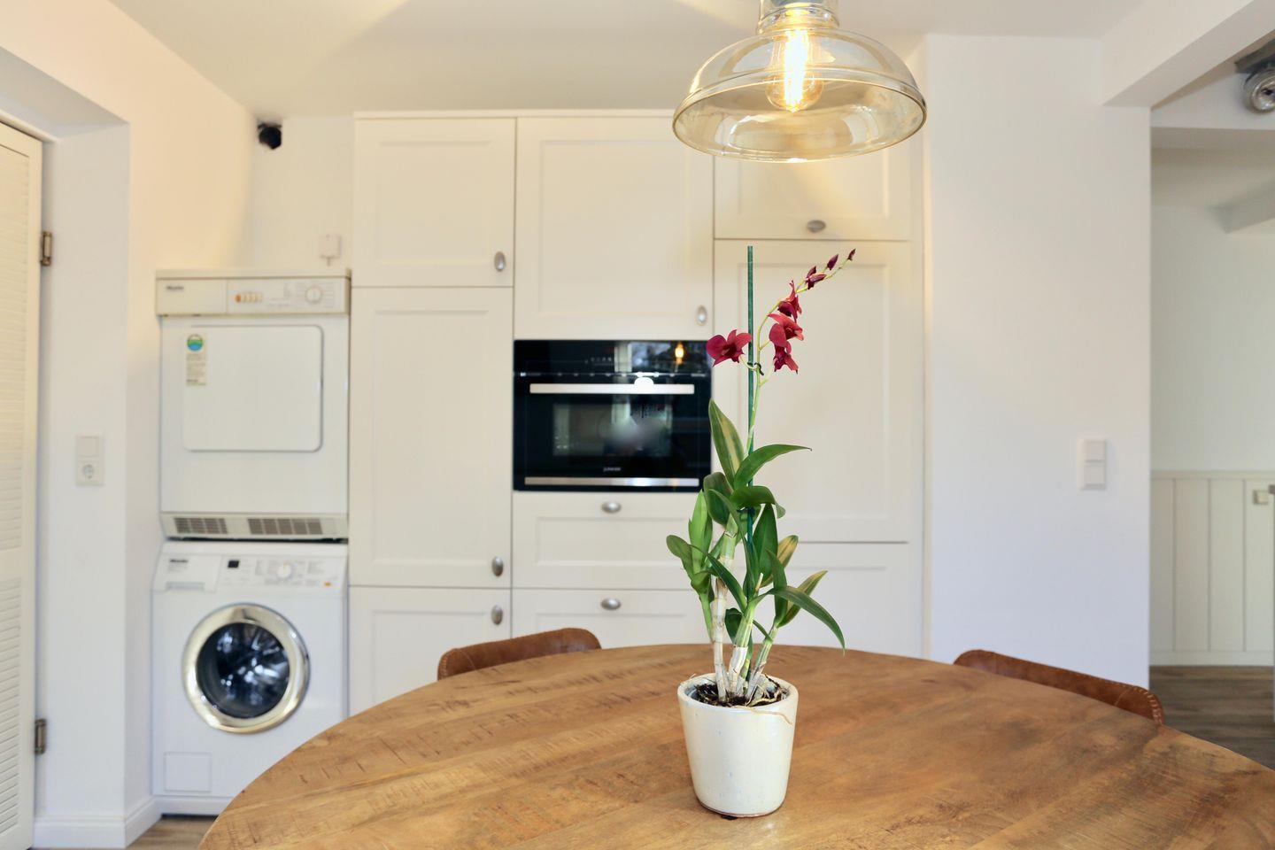Für Ihren Komfort stehen Ihnen eine Waschmaschine, ein Trockner sowie Bügelbrett und Bügeleisen zur Verfügung. Entspannen Sie auf der Terrasse mit Grillplatz und hochwertigen Terrassenmöbeln oder nutzen Sie die vier bereitgestellten Fahrräder, um die Insel zu erkunden (Nutzung auf eigene Gefahr). Ein besonderes Highlight ist die Gartensauna mit Ruheraum, die Ihnen pure Erholung bietet.