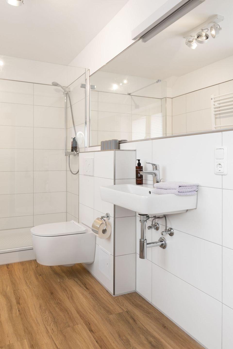 Das Badezimmer mit Fenster bietet eine große, ebenerdige Dusche sowie Waschbecken und WC. Seife, Duschgel und Shampoo stehen für Sie bereit. Zwei zusätzliche ostfriesische Schlafkojen in Form eines Etagenbettes befinden sich abseits vom Wohnraum.