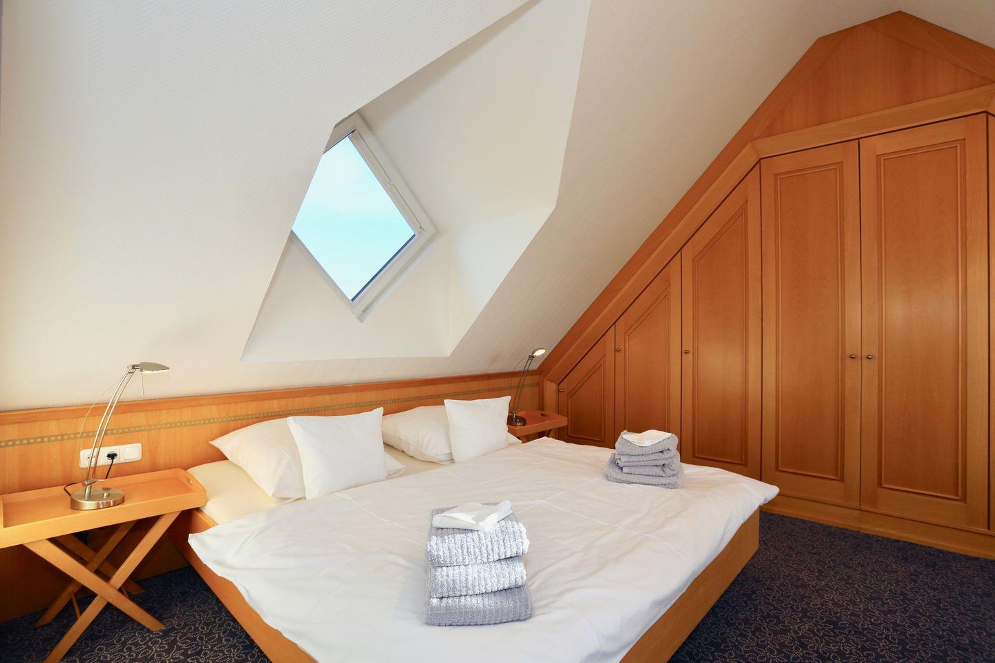 Im Schlafzimmer unter dem Spitzdach finden Sie ein komfortables Doppelbett (180 x 200 cm), einen Schreibtisch, großzügige Schränke, einen Safe und ebenfalls einen Flachbild-TV.