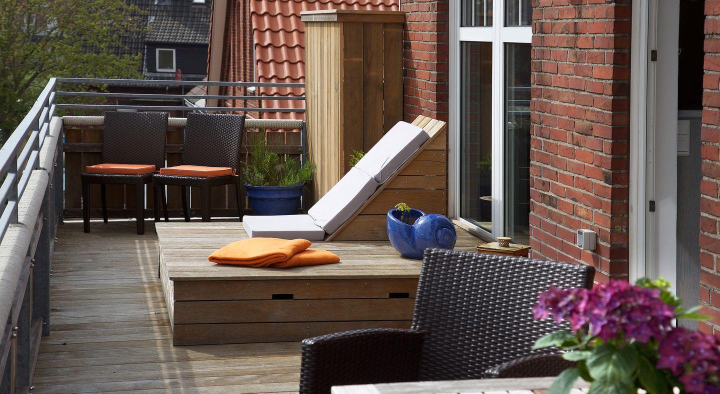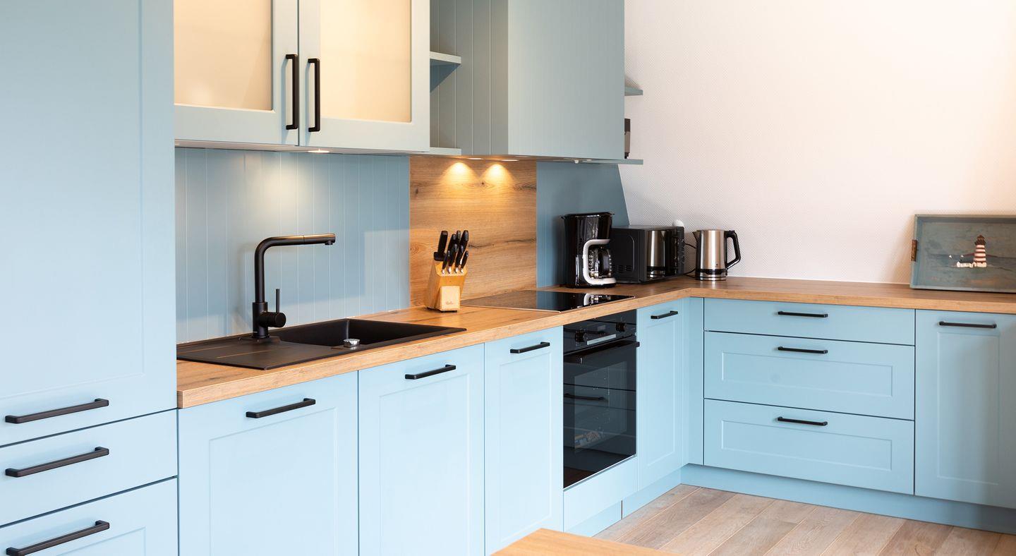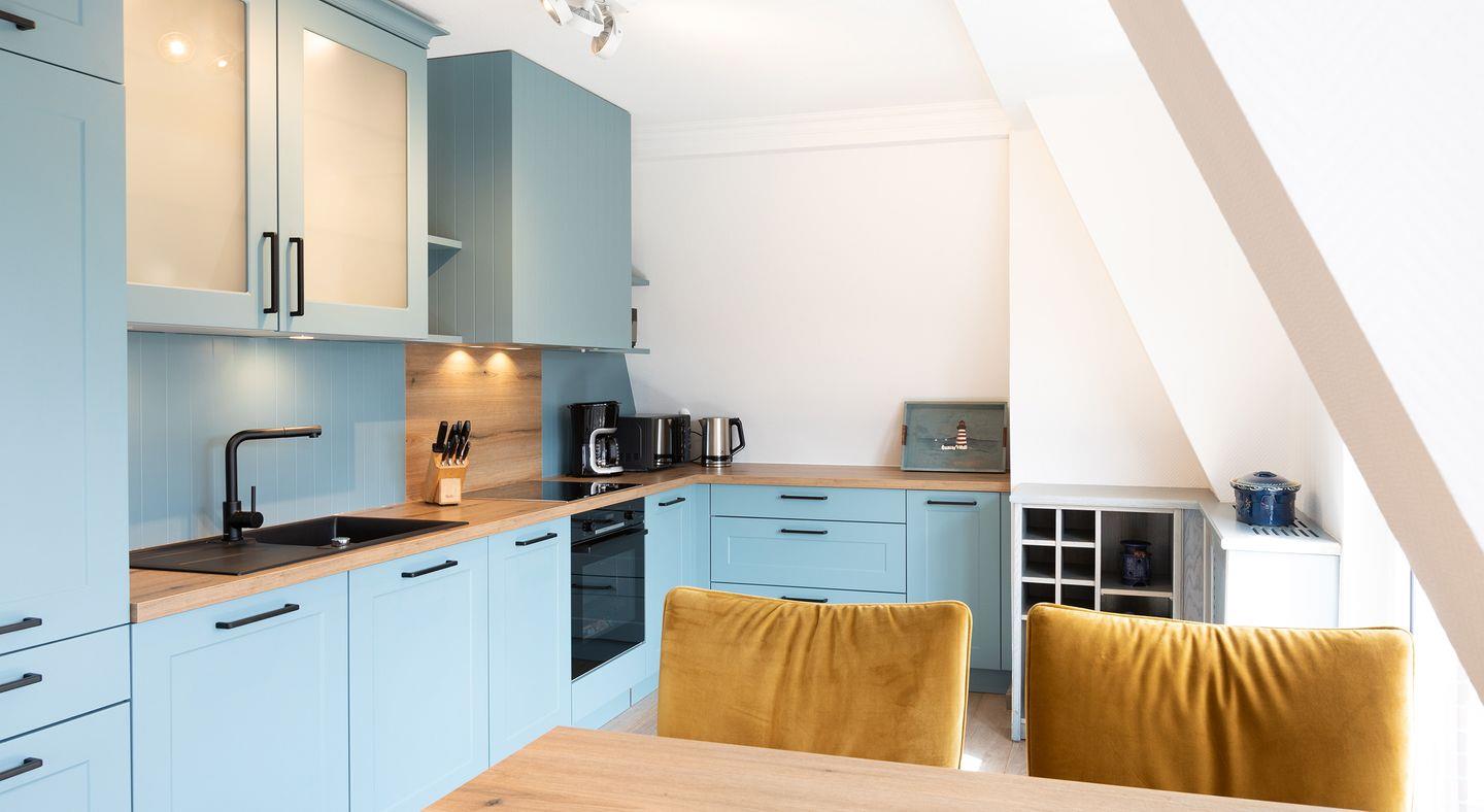 Genießen Sie den Komfort eines großen Balkons zur Südseite mit herrlichem Teilblick auf das Juister Wattenmeer. Das Wohnzimmer verfügt über einen großen Flachbild-TV und lädt mit einem hohen sowie einem runden Esstisch, einer gemütlichen Sofalandschaft zum Verweilen ein. Die Küche ist komplett ausgestattet mit Backofen, Wasserkocher, Kaffeemaschine, Toaster und Spülmaschine.