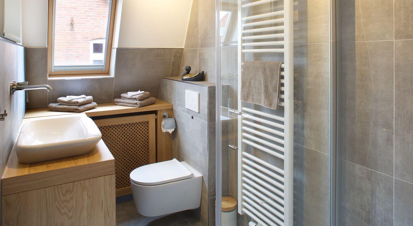 Die Badezimmer mit Fenster bieten eine große, ebenerdige Dusche sowie Doppelwaschbecken (in einem Bad) und WC. Seife, Duschgel und Shampoo stehen für Sie bereit.