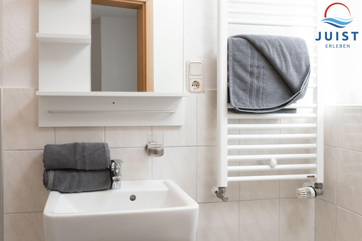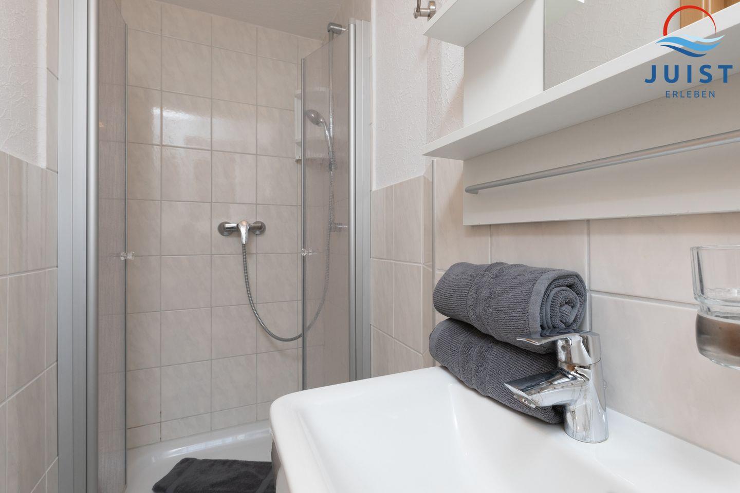 Im Badezimmer mit Dusche finden Sie alles für entspannende Momente nach einem Tag am Strand. Handtücher und Bettwäsche sind inklusive.