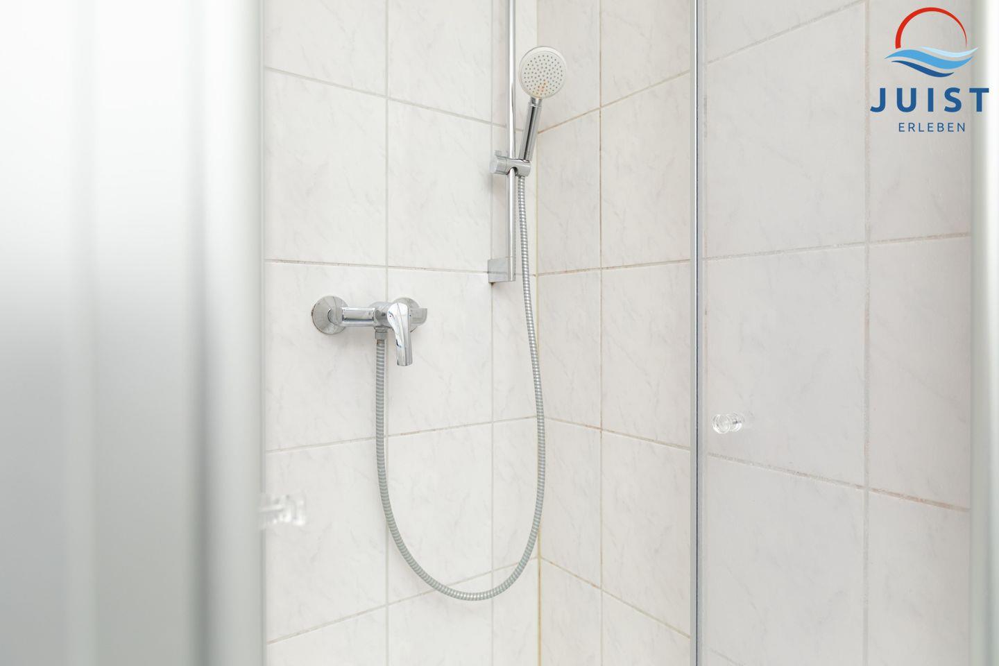 Im Badezimmer mit Dusche und Fenster finden Sie alles für entspannende Momente nach einem Tag am Strand.
