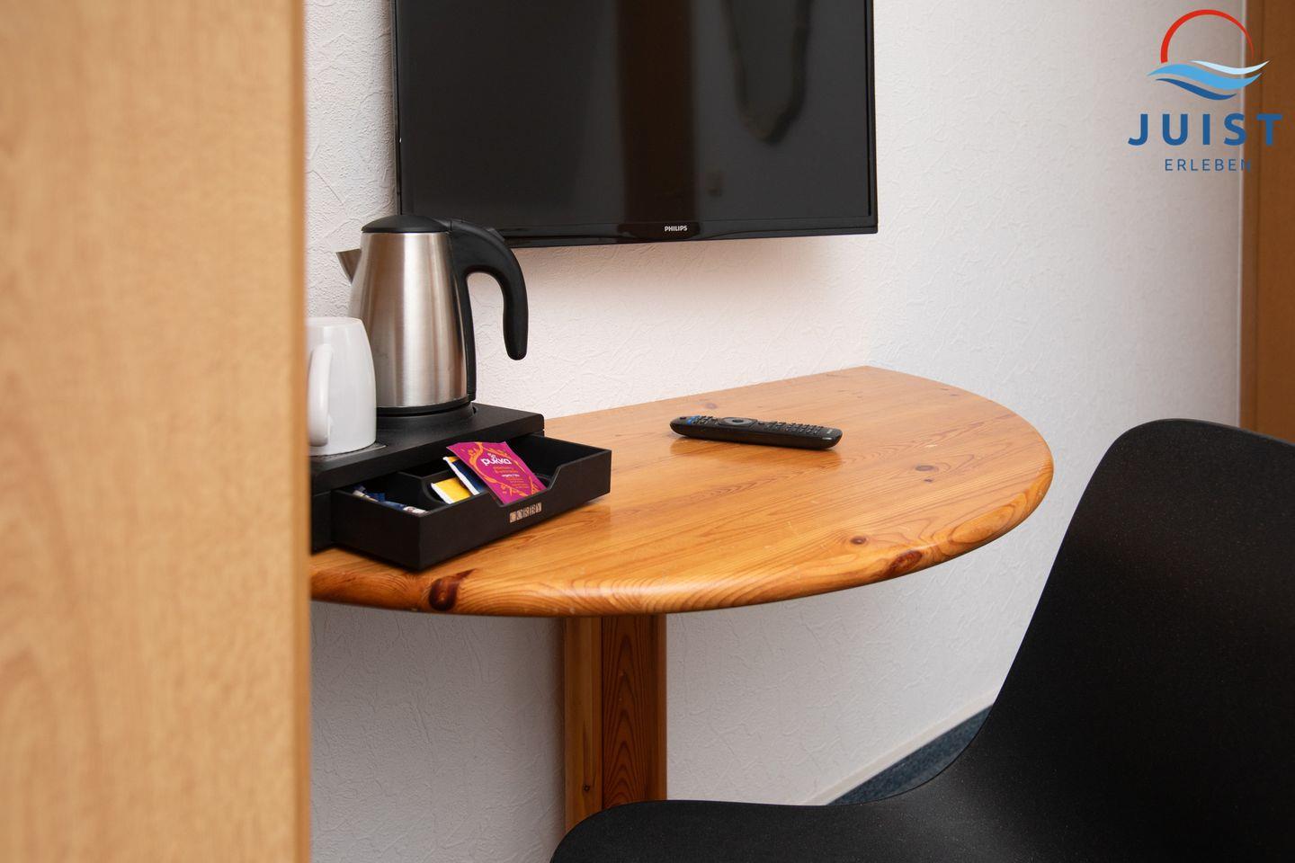 Das geschmackvoll eingerichtete Zimmer Nummer 6 verfügt über ein bequemes Bett, einen praktischen Schreibtisch und einen Fernseher sowie Radio für Ihre Unterhaltung. Im Badezimmer mit Dusche finden Sie alles für entspannende Momente nach einem Tag am Strand.