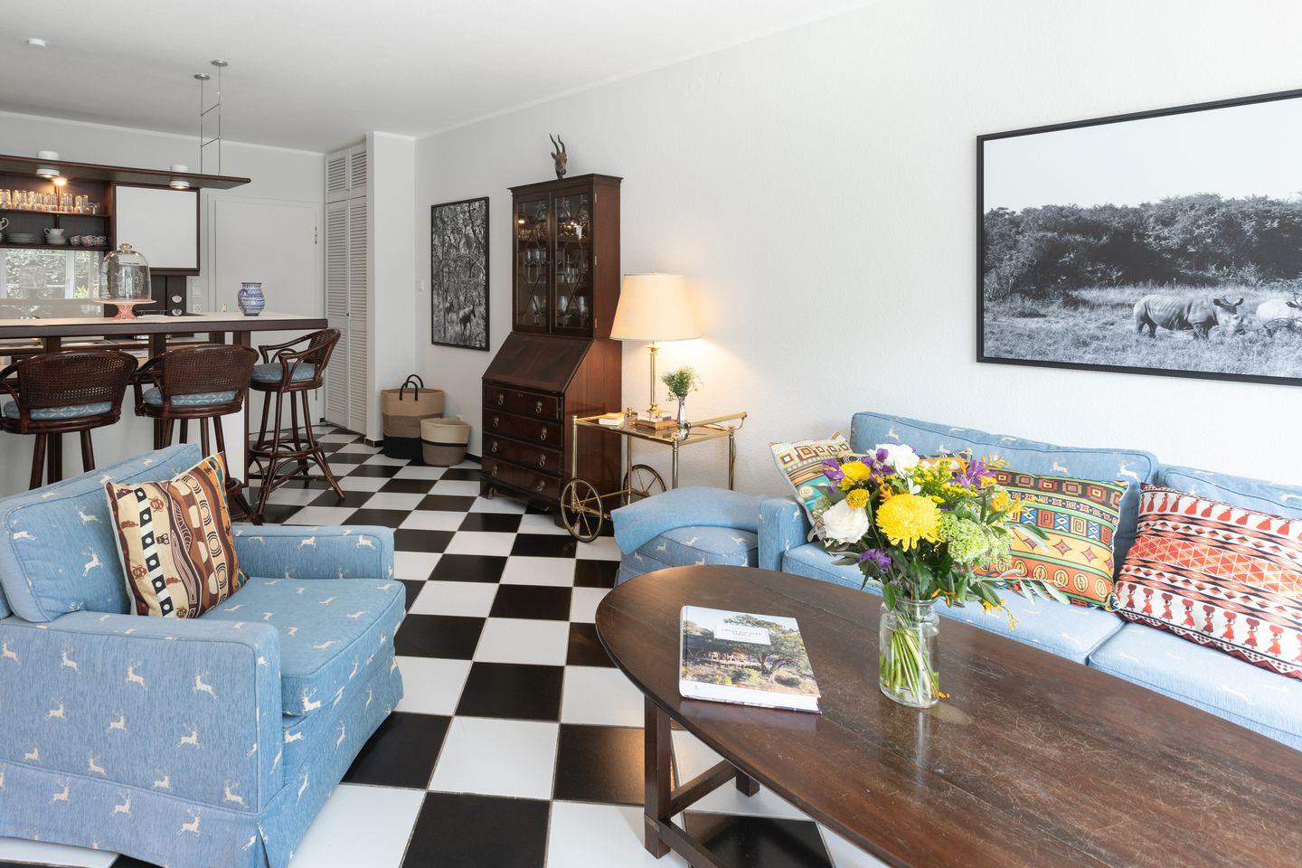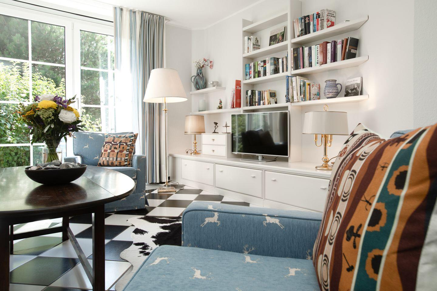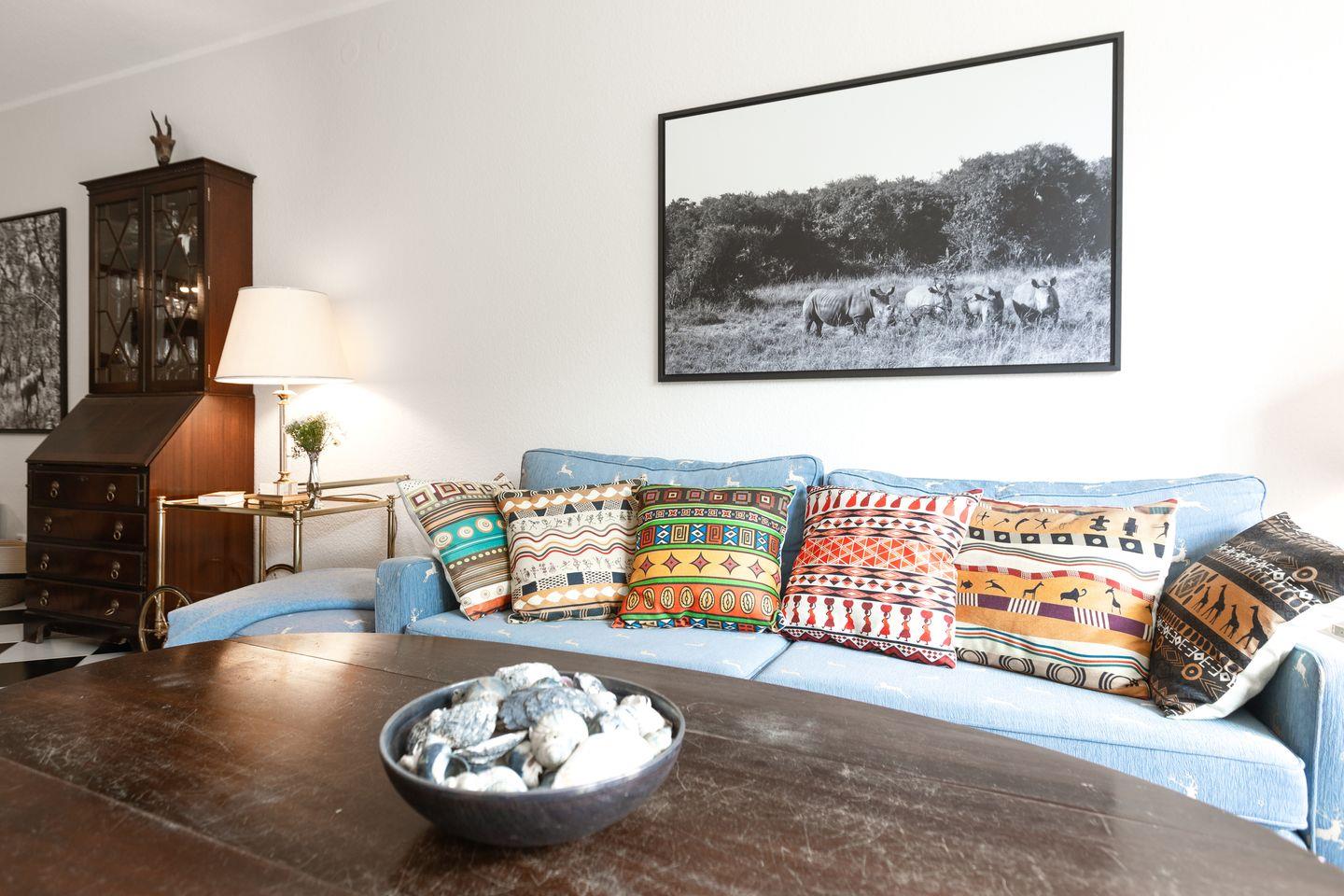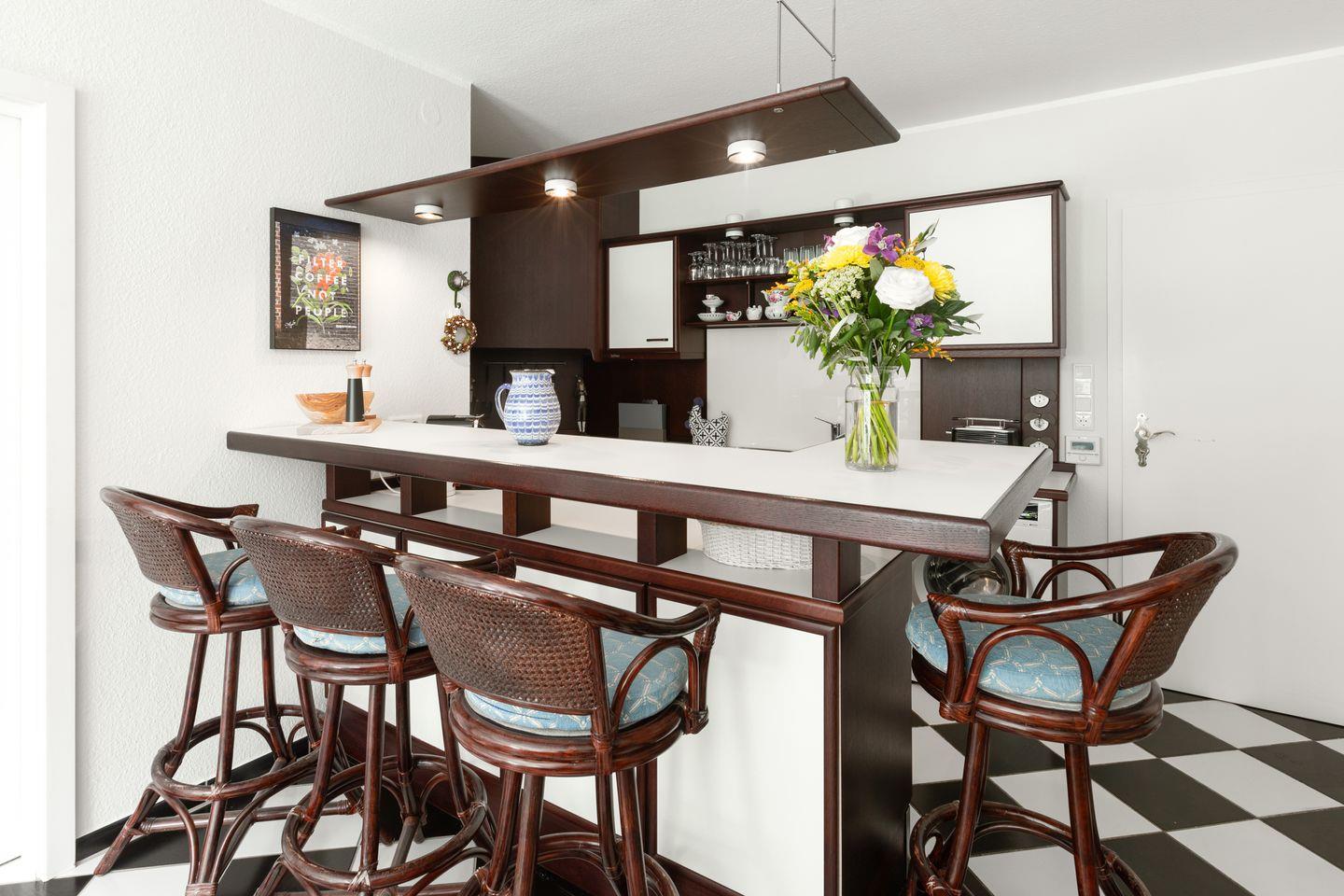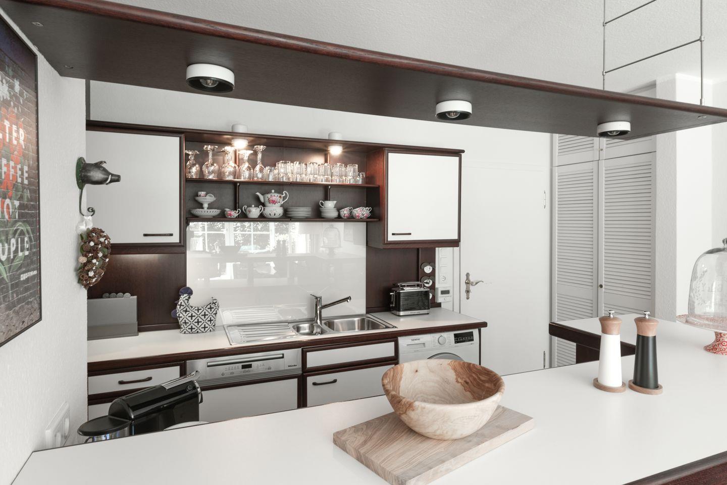 Die Wohnung ist modern und liebevoll eingerichtet und eignet sich perfekt für Paare oder kleine Familien. Der Wohnbereich ist lichtdurchflutet und lädt mit bequemen Sitzmöbeln und einem Fernseher zum Entspannen ein. Eine offene, gut ausgestattete Küche mit Geschirrspüler, Herd und Backofen sorgt für Komfort während des Aufenthalts.