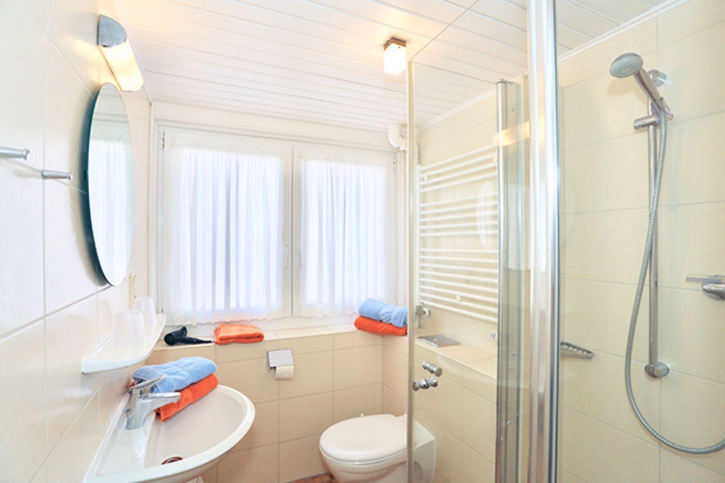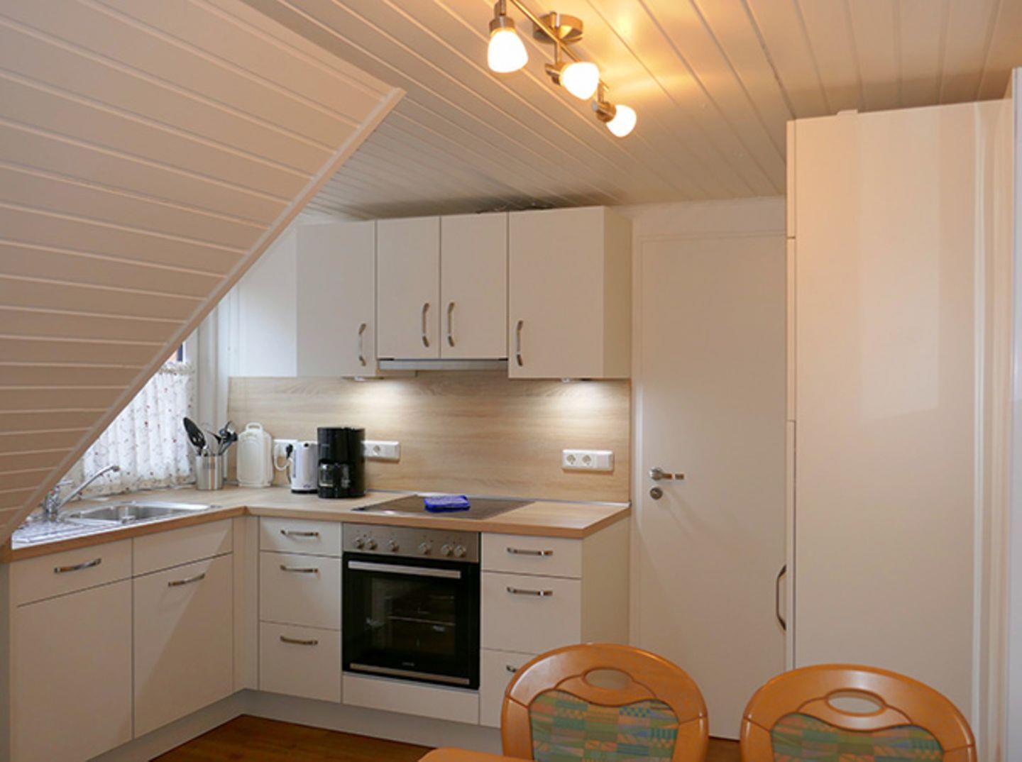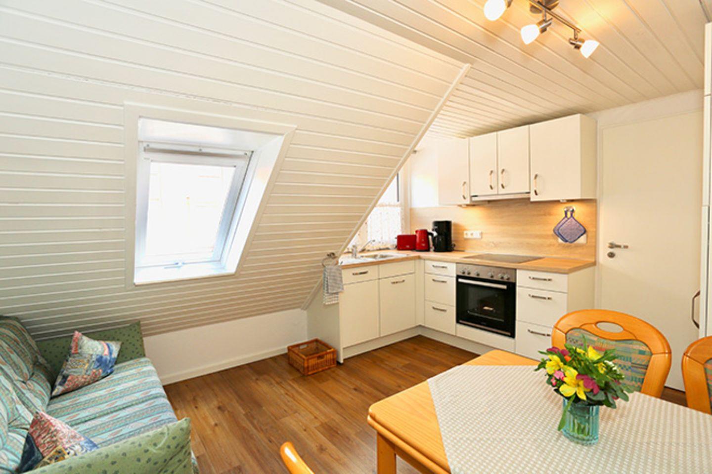 Der Wohnbereich dieser Wohnung ist größer, als es die 45 qm vermuten lassen. Denn die Flächen unter den Dachschrägen zählen nicht mit, sorgen aber zusätzlich für Raum – und für Behaglichkeit. Auch diese Wohnung ist sehr zweckmäßig gegliedert. Der gemütliche Wohnbereich und die große Wohnküche mit Essraum sind hier getrennt. Beide sind komplett ausgestattet mit Kabelfernsehen/Radio (auch gute Bücher fehlen nicht) bzw. mit allen wichtigen Küchen-Accessoires. In der Küche besteht eine weitere Schlafmöglichkeit, hierfür steht eine Klappcouch zur Verfügung. Das Bad verfügt über Dusche und WC. Diese Wohnung ist bei unseren Gästen besonders wegen ihrer 'Wohlfühl-Atmosphäre' und des schönen Blickes ins Grüne und über die Dächer der Ortschaft beliebt. Hinter den großen Fensterflächen liegt der Balkon Richtung Süden, der nicht nur besonders großzügig ausgelegt ist, sondern durch seine quadratische Grundfläche auch sehr vielseitig genutzt werden kann.