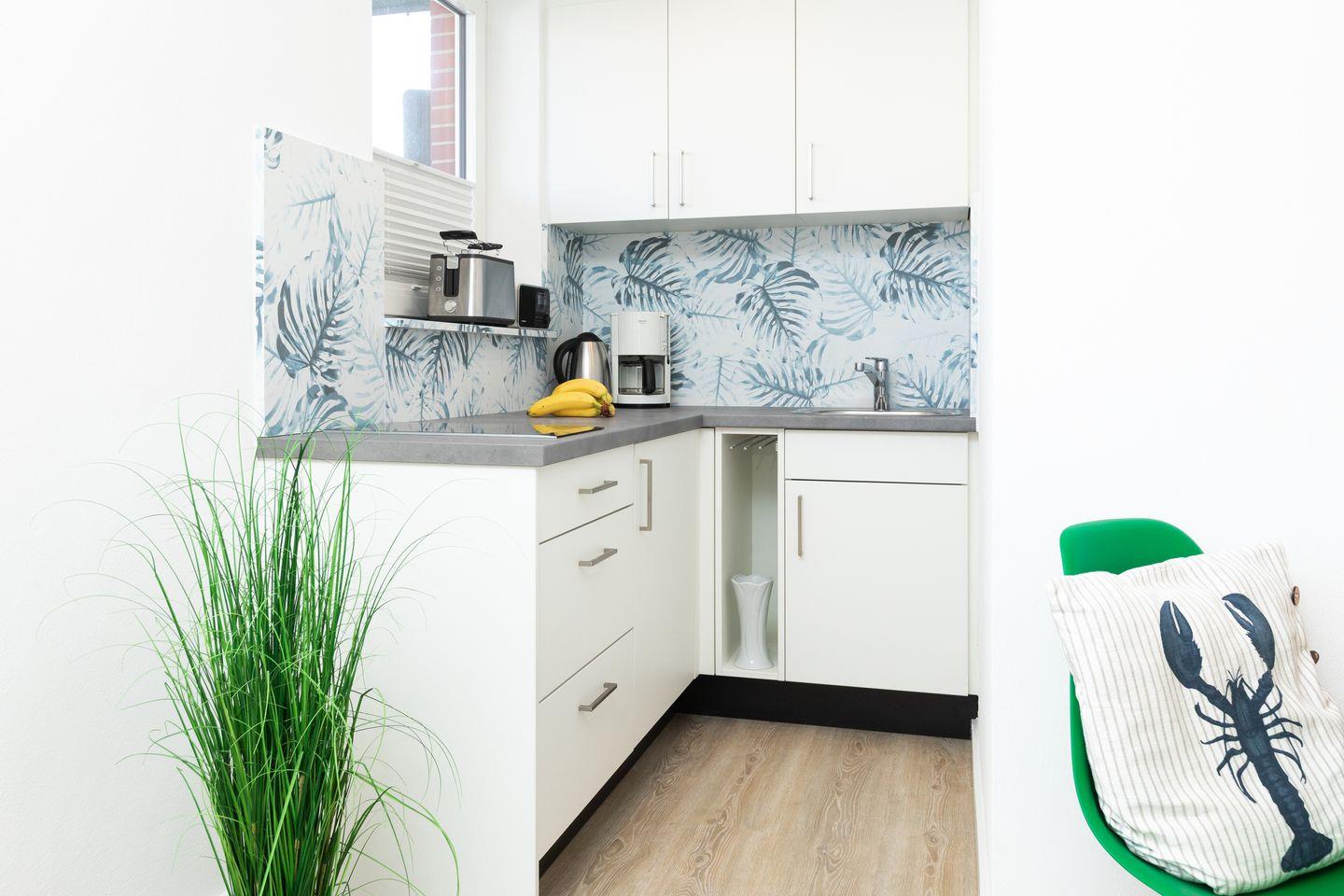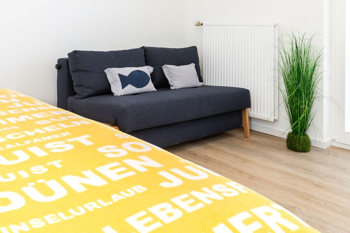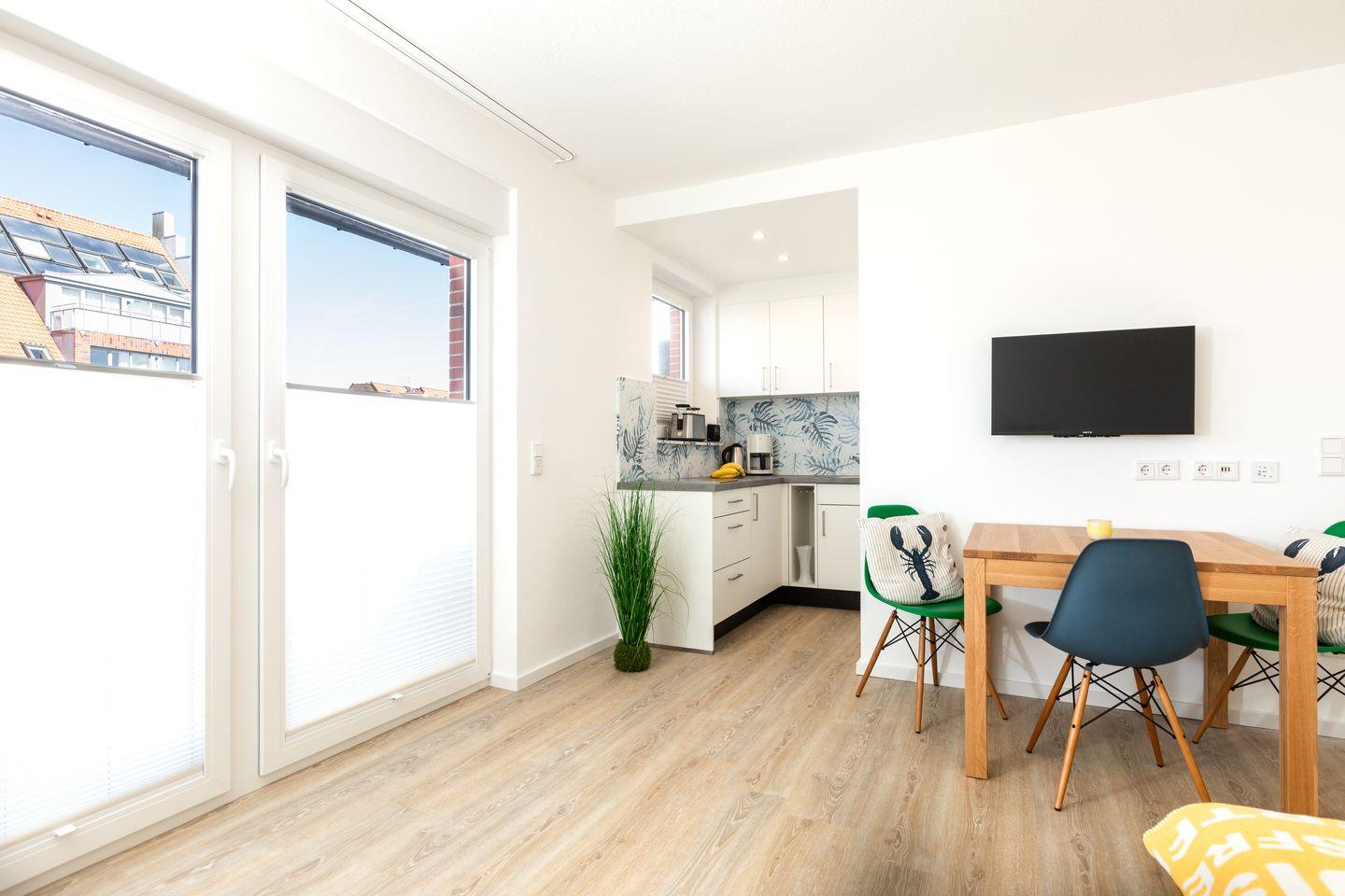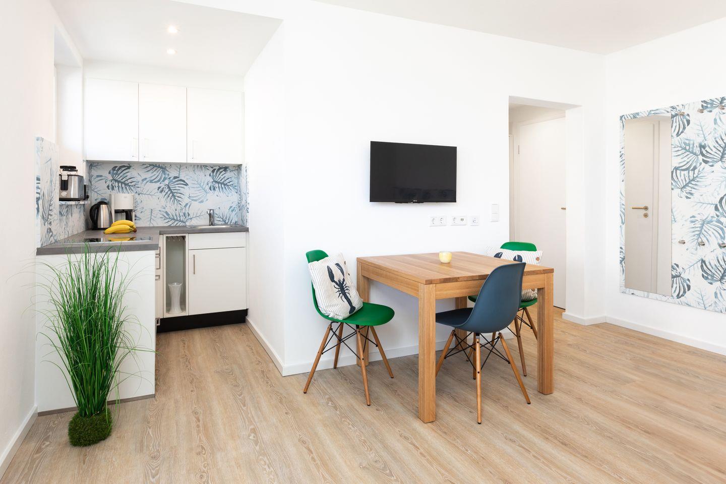 Das Appartement verfügt über ein Doppelbett und ein Schlafsofa sowie einen Esstisch, wo Sie die gemeinsamen Mahlzeiten in Geselligkeit genießen können. Die Kochnische bietet Ihnen alles, was Sie für die Zubereitung Ihrer Lieblingsgerichte benötigen – vom Herd über Kühlschrank, einer Filterkaffemaschine, bis hin zu Geschirr und Kochutensilien. Darüber hinaus verfügen Sie über einen Balkon mit Strandkorb, der sich ideal für entspannende Stunden an der frischen Luft eignet.